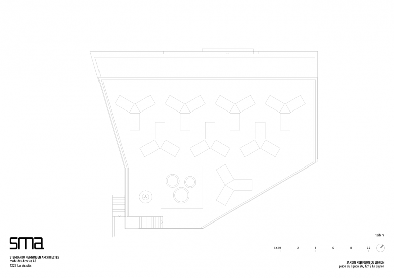 The newly constructed recreational center known as "Jardin Robinson" occupies a strategic position surrounded by the wooded banks of the Rhone on one side and the public facilities of the Lignon district with an emblematic expression of a 1960s concrete on the other side.