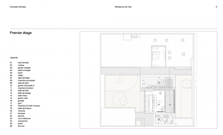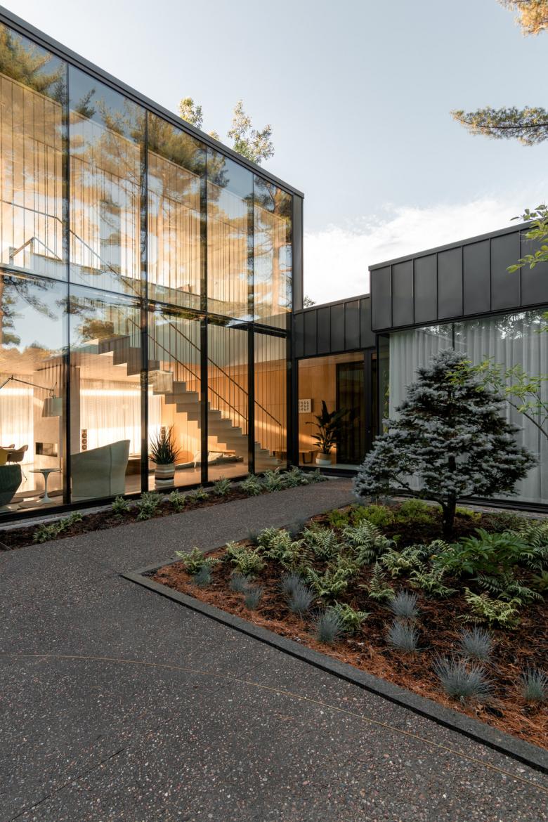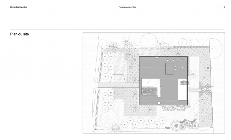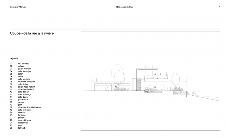 The siting of the residence makes it possible to reintegrate the pre-existing alignments of the land and to therefore conserve as many existing trees as possible. Large coniferous trees were then planted in the heart of the first landscaped courtyard that provides vehicular access. The programmatic distribution of the interior spaces takes into consideration the relationship with the street, the relationship to the river, the solar orientation and the specific needs of the inhabitants. Also, the living room space was lowered a few steps and a glass pavilion has been installed on the roof. While initially design as a single-storey house, the pavilion creates a variety of spatial experiences.