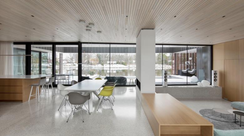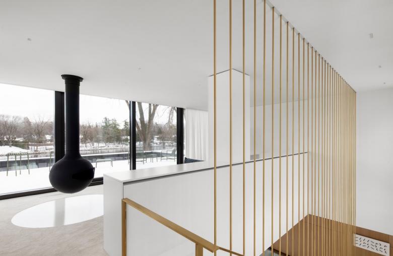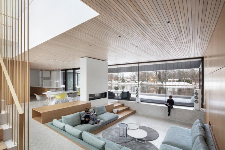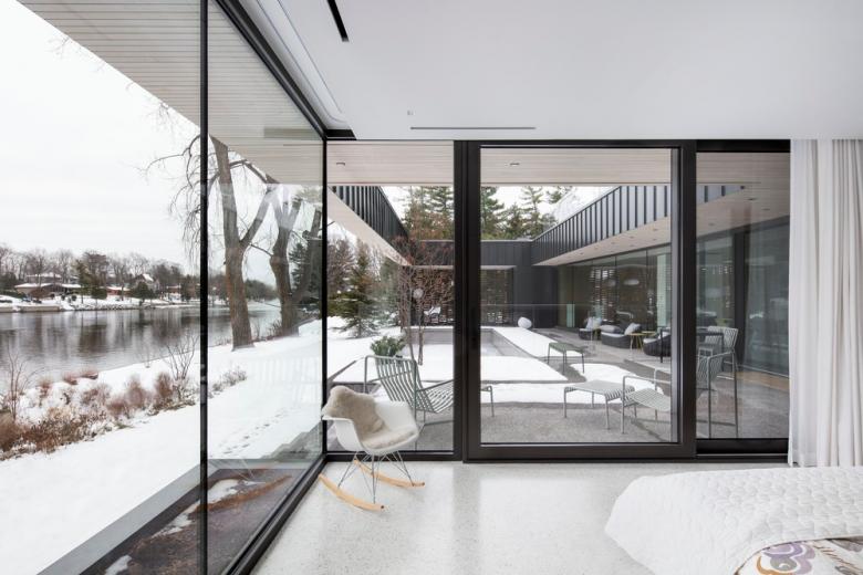 The mezzanine space that allows residents to benefit from an additional view onto the river serves to accentuate the composition and break up the horizontality of the residence. Some areas of the roof are covered with a white granular membrane while others have been landscaped, offering a green and temperate environment for this level. The overall emphasis of a sustainable design approach is enhanced through the incorporation of geothermal wells that provide both heating and ventilation for the residence.