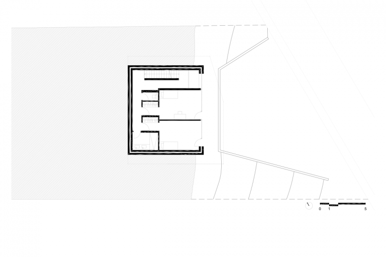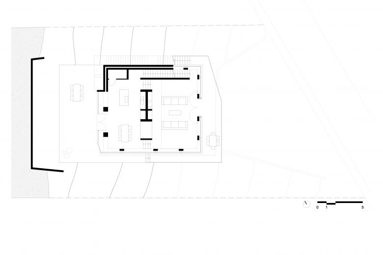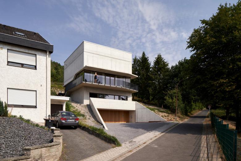 The Röhrig House is located on a steep slope on the edge of the buildable land of Sinzig-Westum, a German municipality between Bonn and Koblenz. The client, a young family with one child, wanted to have generous interior and exterior shared areas, in combination with a rather classical program: two children's bedrooms, a home office, a parents' bedroom, and two bathrooms.