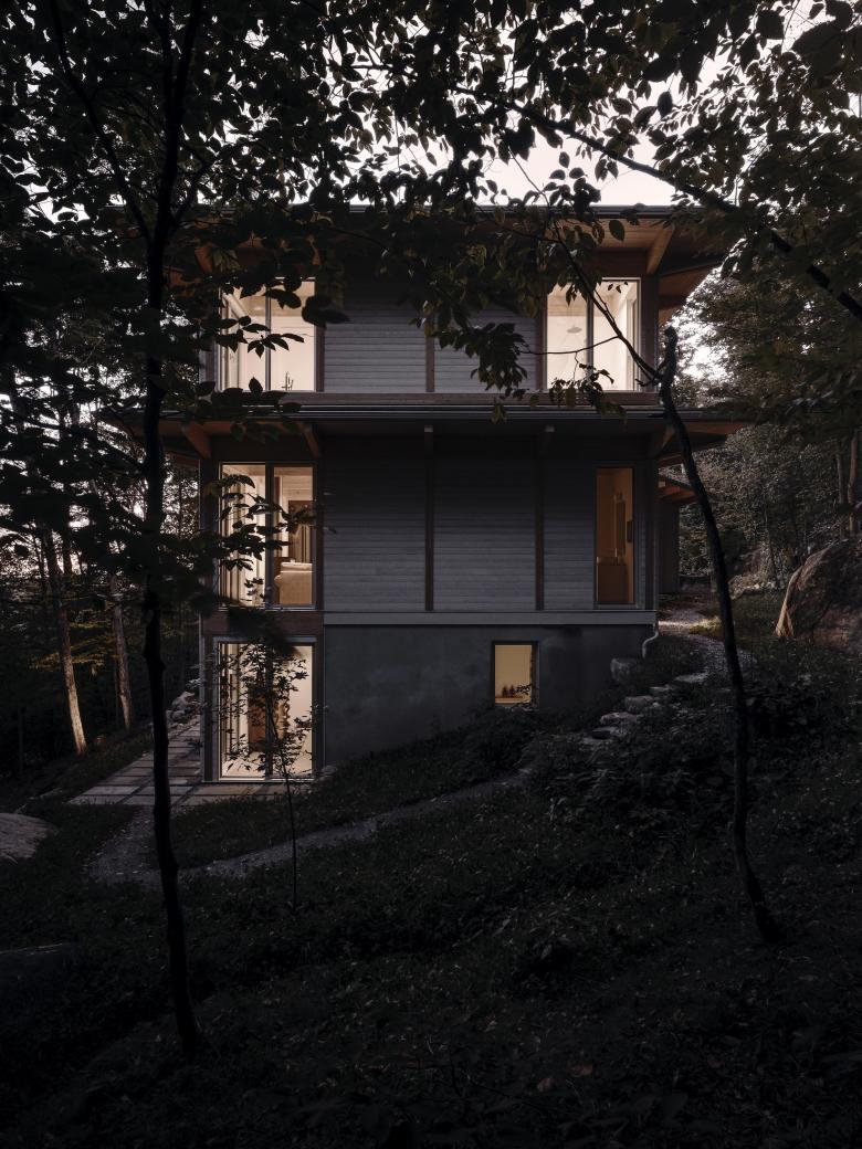In a natural setting at the limits of constructability, Rolo offers a landscape approach to an architectural project. Located in the Laurentian region of Quebec, and situated on a steep slope, the property is characterized by large, rocky outcrops and offers clear views of the Laurentian horizon.