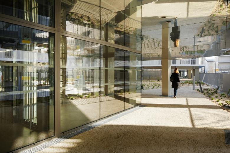 Subtly playing with framework and motifs within the unity of light and luminous tints, the project gives a refined image. However it is simply the assembling of simple materials which, when superposed and enhanced with graphics and precision, engender a poetic quality. The façades glisten and play with light and orientation. This new neighborhood shines day and night, providing the city with a new, lively and dynamic landmark.