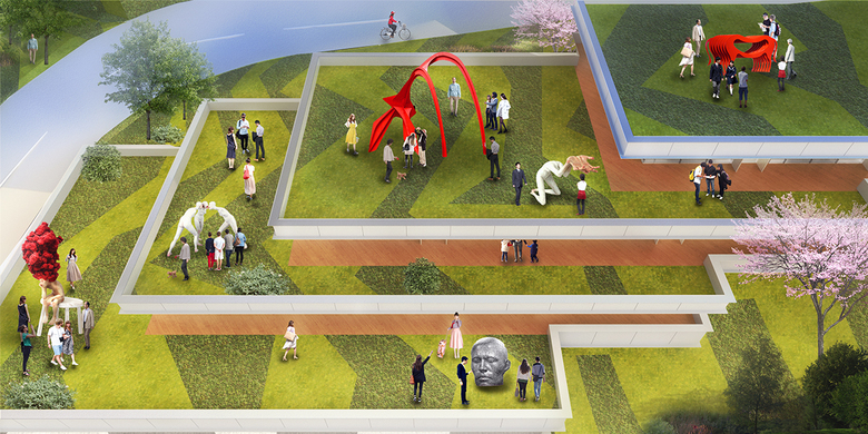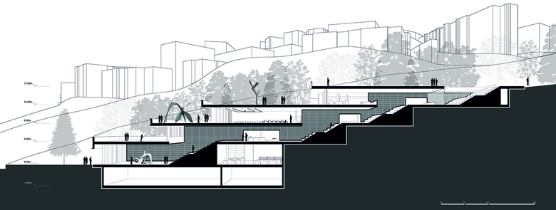 The new Pyeongchang-dong Art Complex of Seoul is conceived as four stacked pavilions, integrated the natural slope of the site; The building becomes the extension of the surrounding green environment. The hilly site integrated volume is introduced in order to minimize the disturbance to the natural environment. The building shows itself from the top in symbiosis with the landscape, becoming a multiple series of green terraces that are easily reachable from the public.