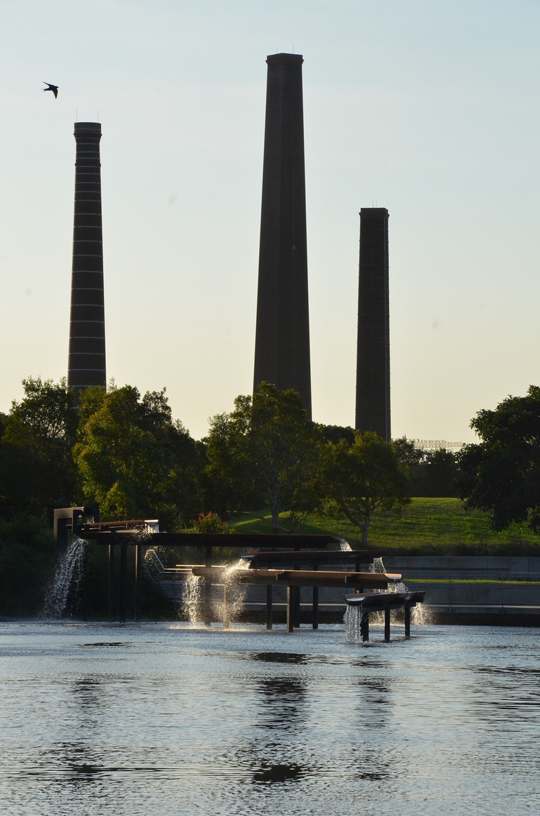 Highlighting these processes was an important part of the project, as they emphasise the intrinsic relationship between water, people, topography, flora and fauna. Public art is interwoven; Turpin + Crawford Studio’s ‘Water Falls’ celebrates clean water release while also working with TDEP’s cascades to aerate water in the last link in the bioremediation treatment train. Turpin + Crawford Studio also devised the water ‘exhaust fans’ that celebrate the transfer of water from bioremediation ‘paddies’ to the lagoons; playing on the spirit of water and its interactions with the landscape.