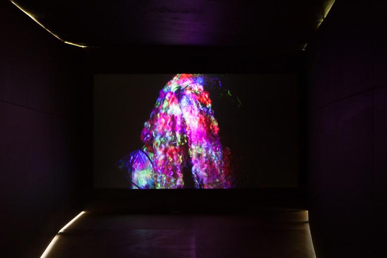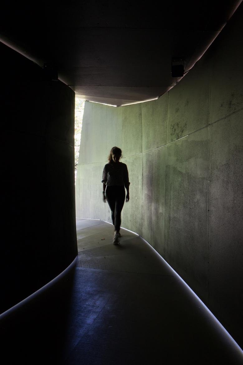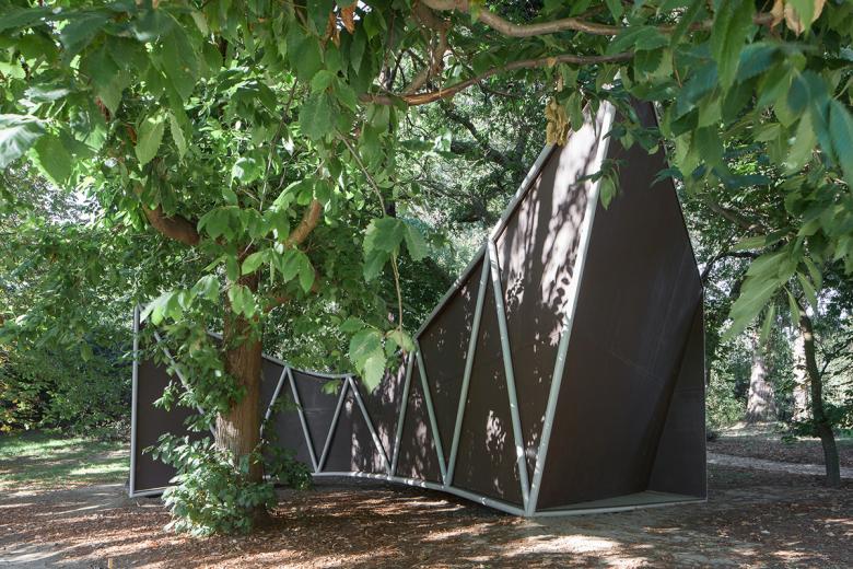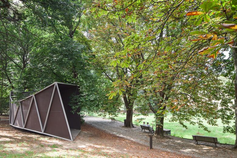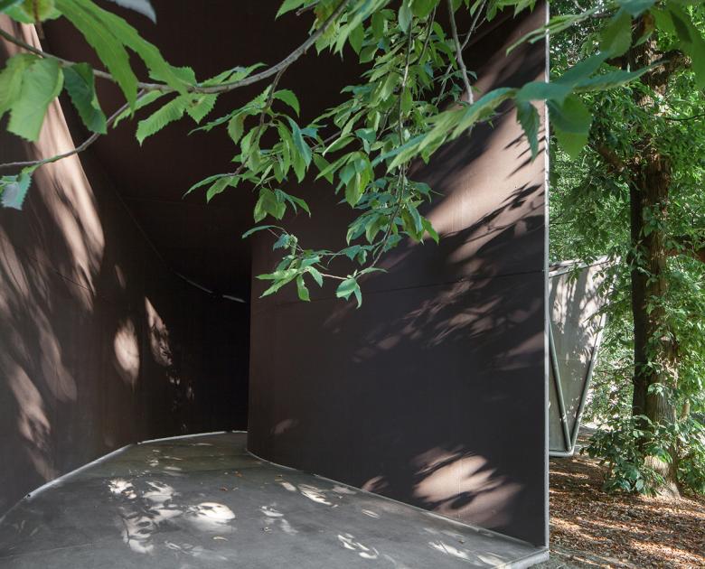 The piece challenges the traditional approach to temporary pavilion design. Its shape is equal parts seductive and harmonized with the natural context. The pavilion invites the visitor to enter by letting in snippets of daylight that lead into a sheltered path of increasing quietude. Step by step, the rich vegetation of the park is left behind until the visitor reaches the video display which can be enjoyed in quiet and secluded darkness.
