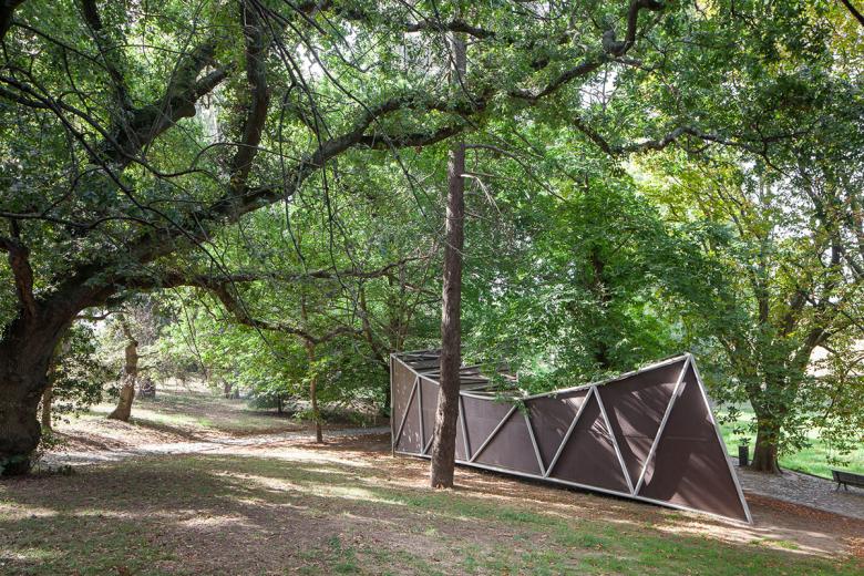 Inspired by this duality, FAHR designed an object that proposes an intriguing dialogue between architectural scale and the natural setting of Serralves. The pavilion softly stands supported by only two points that subtly connect with the natural surroundings, thus underlining the park’s topography, vegetation, and meandering paths.