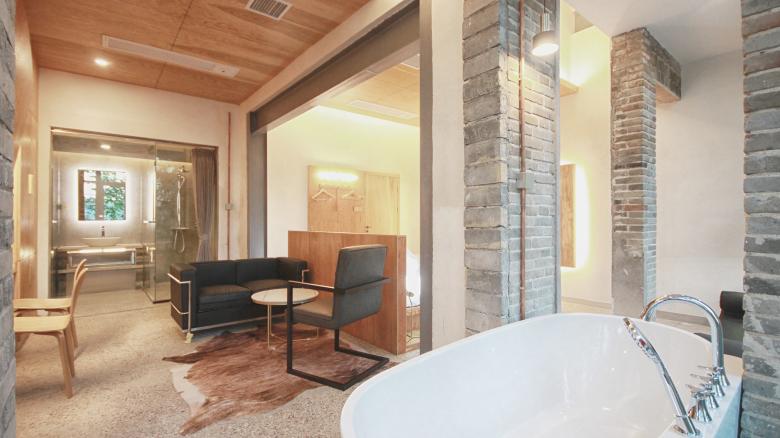 People are closely connected with nature in this place. The original three big trees have been preserved and become part of the building in terms of facade and plan structure. French windows and the attics suspended in the air. People living here are so easily enter into the external environment getting along with the natural elements. In such a quiet and natural environment in the countryside, Ten Times Hotel provides a localized, leisurely and peaceful way of living. More importantly, it adapts to the project’s financial situation in the real world and integrates the site into the local environment with ‘brutalism’ and free from exquisite design languages, to meet site’s current functional needs.