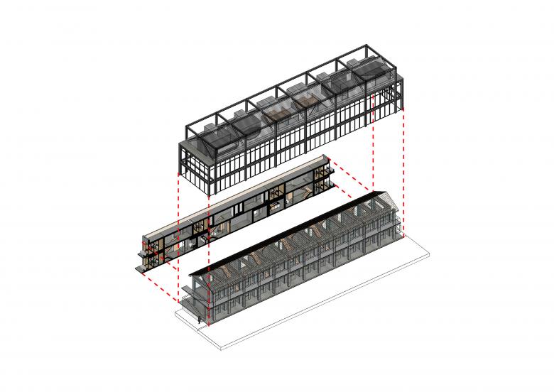 The design of Ten Times Hotel provides a unique transformation strategy for the original old dormitory building. It establishes an external steel frame as the basic structure of the overall building, which sets up a new facade system for the old building, as well as provides structural support for the new roof attic and a new logistics traffic space. The design retains basic shape and volume of the original building.