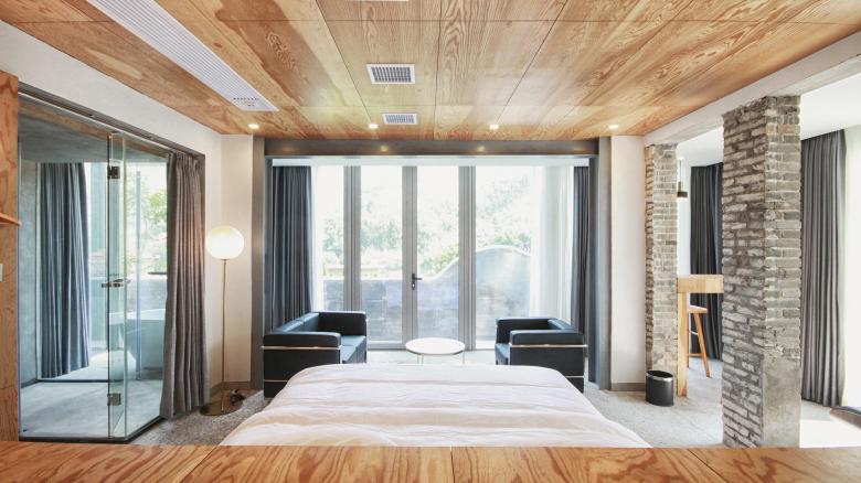 New glass facade reshapes the overall image of the building, and also turns the semi-outdoor corridor space into a part of the indoors, enriching the internal and external space relationship. Most importantly, it makes the indoor space brighter with more sun lights. The exterior walls of 12 original small rooms (15m2 each room) which was arranged in a straight line are partially opened and these rooms are transformed into open and comfortable guest rooms that are immersed with surrounding environment.