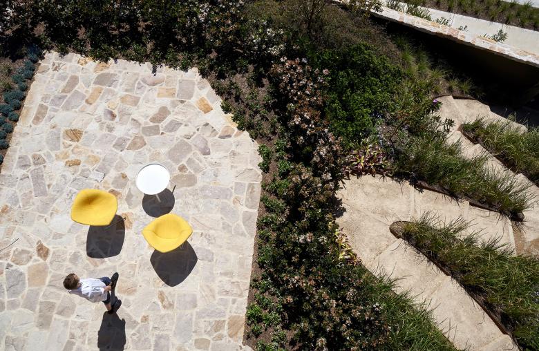 Weathered rock stratums have been replaced by off-form concrete slabs with soft edges, scissoring above a monolithic sandstone storey for the house. An elliptical concrete stair forms the pivot point of each floor of the house, anchoring them to the steep escarpment; the stair also wraps around a lift core that descends, mineshaft-like to link the rest of the house to the garage level.