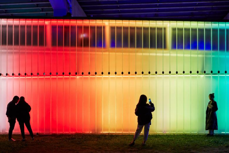 Audiences were invited to move through, over and around the ramp of the Visitor Centre both as observers and subjects of observation, participants in dialogue with the phenomena around them. Thermal imaging cameras relayed and translated the heat energy of visitors into a shifting curtain of light, animating the channel glass facades of the existing building.