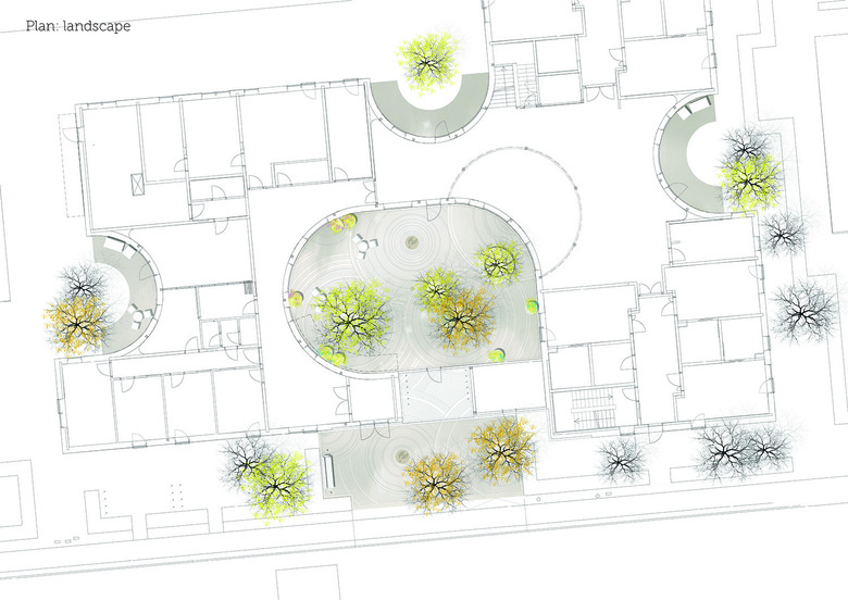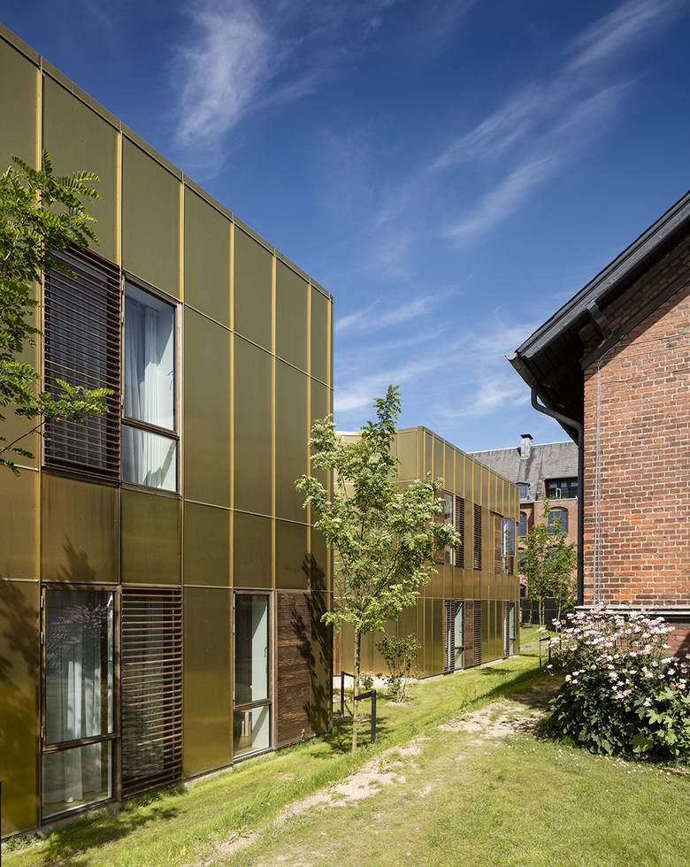 The overall form and concept were heavily influenced by the complex site conditions and the proximity of the neighbouring built context. Within these parameters, the vision was to create a protecting atmosphere that also offers a glimpse to the outside world. The design derives from combining a curved and rectangular formal language that allows for an optimal functional layout. The traditional patient corridor is broken down into smaller units, and, as a special gesture, the house's common area is designed in a curved formal expression, built around a private inner courtyard that works embracingly and protectively. The façade's varying composition of quality rich materials gives the house a warm and tactile look.