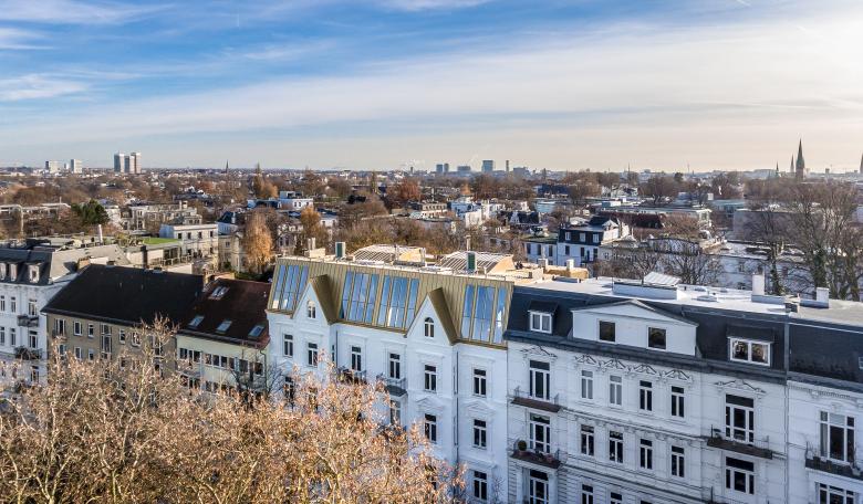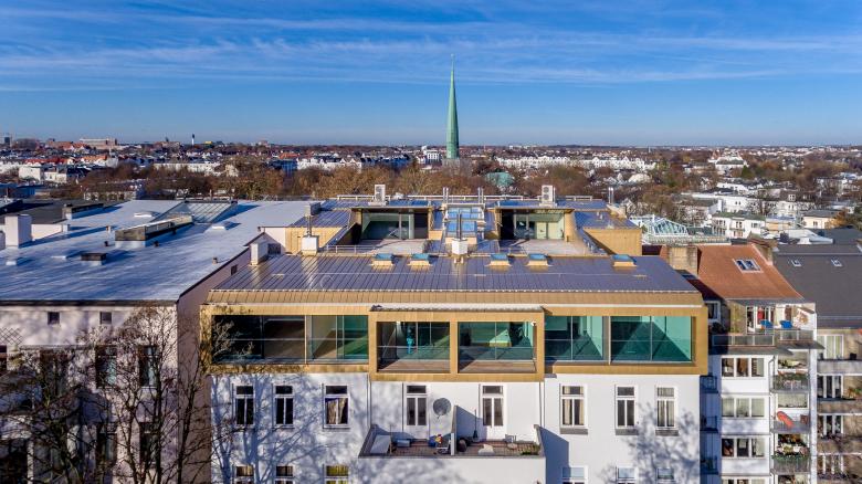 In Hamburg-Harvestehude, in der Hagedornstrasse 31, entstehen zwei hochwertige Penthouses auf dem historischen Mehrfamilienhaus aus dem Jahre 1889, das 1939 vom Architekten Werner Kallmorgen umgebaut wurde. Das viergeschossige Bestandsgebäude wurde als Mauerwerkskonstruktion mit Holzbalkendecken errichtet und erhält mit den zwei neu erstellten Penthouses einen neuen, dem Haus angemessenen Dachabschluss. Die zwei Penthouses sind über das gemeinschaftliche, innenliegende Treppenhaus und über den Personenaufzug erreichbar. Die Terrassen der Penthouses sind in die Dachhaut „eingedrückt“, so dass sie von der Straße aus nicht ersichtlich sind.