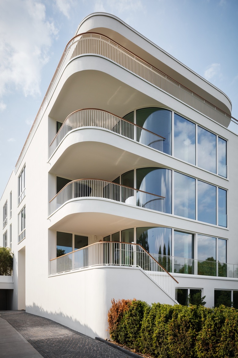 Sechs Wohneinheiten bieten auf vier Etagen und einem Staffelgeschoss Raum für individuelle Gestaltung auf höchstem Niveau. Der Entwurf trägt in besonderer Weise dem Quartierscharakter Rechnung und erweitert diesen durch eine auffällig moderne Villenarchitektur. Die Kubatur fügt sich einerseits in die Nachbarschaft ein, individualisiert sich jedoch gleichzeitig durch die feine und differenzierende Linienführung der geschwungenen Fassadenbänder. Großzügige Terrassen mit markant feingliedrigen Geländerelementen und die dahinter liegende Fensterfront folgen diesem Schwung und sorgen für einen unmittelbaren Bezug zum Alsterpark.
