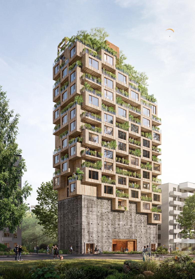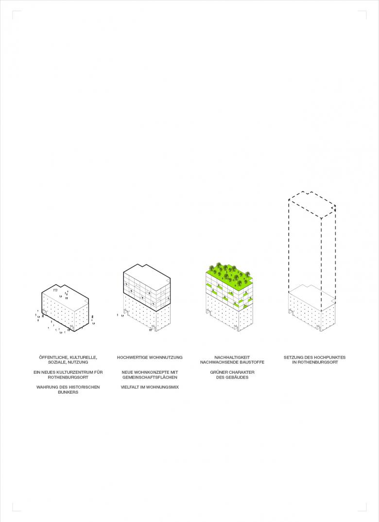 Der Bunker als Bestandsgebäude bietet ausreichend Volumen für eben dieses neue Stadtteilzentrum von Rothenburgsort und dient baulich zusätzlich als Fundament für ein markantes und weithin sichtbares Wohnhochaus in Holzbauweise. Die typisch spröde Betonoptik des Bunkers wird durch die funktional ablesbare und gelungene Architektur des neuen Wohnens aufgewertet. Der Kontrast der beiden maßgeblichen Baustoffe, Beton und Holz, verleiht dem Projekt ein gelungenes Maß an Spannung und fokussiert auf den in den oberen Etagen gewonnen Lebensraum für zahlreiche neue Bewohner des Quartiers. Das Projekt entspricht damit in jeder Hinsicht dem Gebot der Nachhaltigkeit und macht diese deutlich erlebbar.