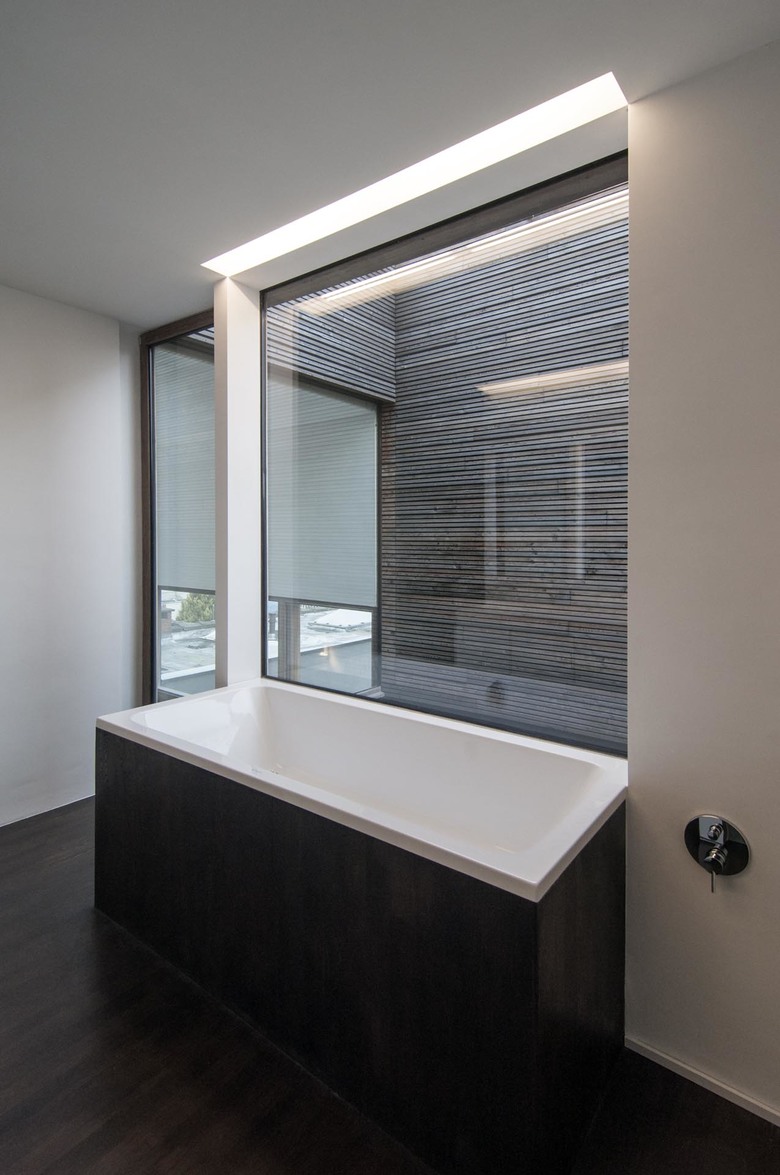 A second significant intervention consists in partly opening up the stairs. Internal windows were made in the bathrooms to make the stairs in the middle of the house bath in light and it made the stairs the real node in the house.