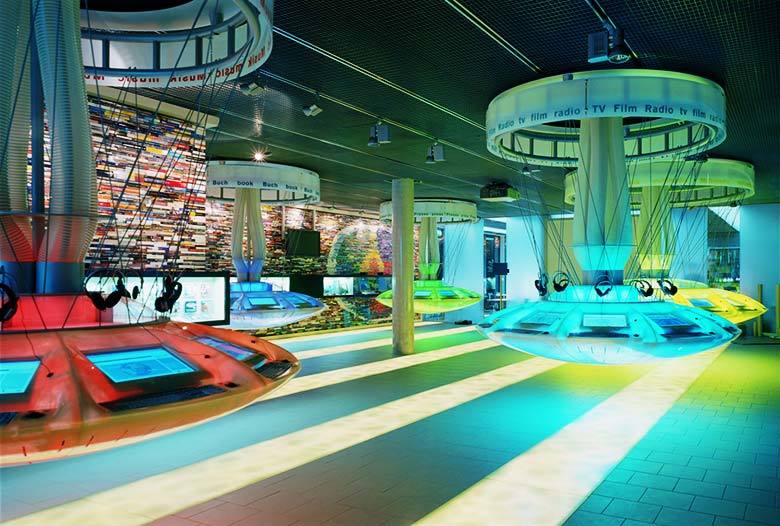 Schwebende Monitorkonsolen repräsentieren die 5 Unternehmensbereiche von Bertelsmann und zonieren den Raum. Sie korrespondieren mit der Architektur des von James Turell illuminierten Pavillons “Planet M“ auf der EXPO und sind Sinnbild für die neue, digitale, multimediale Ausrichtung des Unternehmens. Darüber können sich die Besucher an den integrierten Terminals informieren. Eine Wand aus über 10.000 Büchern symbolisiert die Herkunft des Unternehmens – den Buchverlag – und kontrastiert als haptisches, analoges Element.