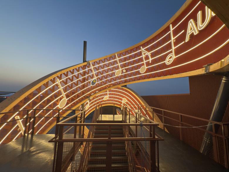 An iconic spiral sculpture rises dramatically into the air, serving as the visual centrepiece of the Austria Pavilion at the World Expo. Viewed up close, it reveals itself as an oversized wooden musical staff featuring the opening bars of the Ode to Joy. The spiral holds a universal symbolic power that transcends cultures. It invites reflection on the cyclical nature of life, on change, growth and transformation – beyond linear models of progress.