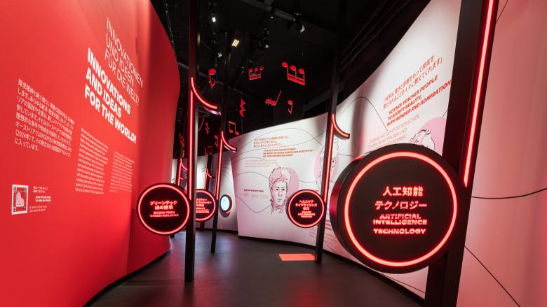 The exhibition inside the pavilion is spread across three rooms. In the first space, the music staff comes to life and turns into a projection surface. Here, visitors experience the richness of the relationship between Austria and Japan in a captivating musical opening. From there, they move on to oversized interactive notes, where they can playfully explore the diversity and strengths of Austria’s economic and societal landscape. The final room marks the highlight of the exhibition: the Cathedral of the Future. In this space, visitors engage interactively with the future and are invited to participate in composing it – in line with the motto ‘Composing the Future’.