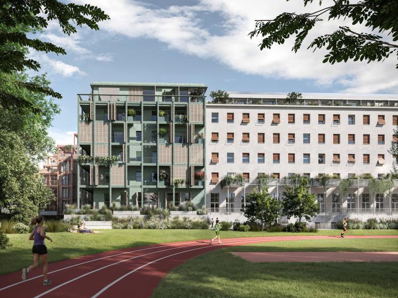 Mostly south-facing, with an unobstructed view of the greenery, a total of 57 freehold flats are being built, starting at 40 sqm of living space. These are located at the rear of the listed existing building, while a new building in the Cree construction method developed by Rhomberg, a timber-hybrid construction method, is planned for section E – designed as a terrace house to create generous open spaces. In order to preserve the existing trees as much as possible, wooden decks are planned on the ground floor in the middle of a ‘wild’ landscape with ground-covering plants.