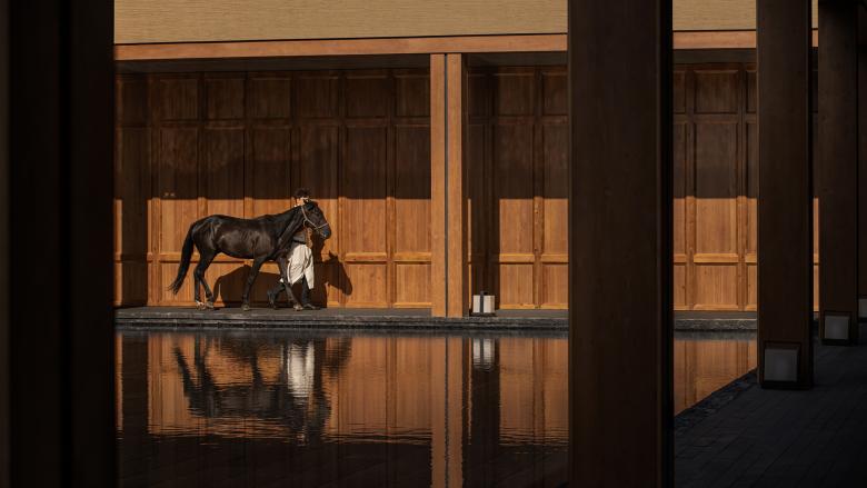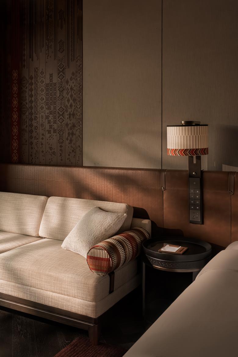Partitions and wall features subtly reinterpret the local yurt’s diamond-grid wooden framework—robust yet refined—bringing openness, rhythm, and ease to the space. Finely crafted accents, such as silver-plated horse tack, symbolic nods to naan and the komuz, and artworks inspired by horses and other grassland creatures, together form a warm, homelike sanctuary infused with nomadic spirit.