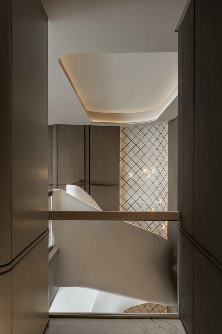 The wall veneers beside the staircase draws on Bottega Veneta's iconic Intrecciato pattern, which highlights a unique style and character while also exploring an integration into modern life so as to a create an exquisite living atmosphere.