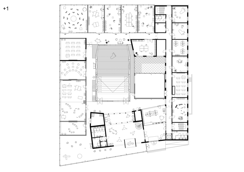 We wish to complete the unfinished, by filling up the void and thus, maximizing both internal and external contact surface. A new two-storey pedestal reacts to the topographical height difference and creates a horizontal academic “landscape”. MWD is thus acoustically buffered in the lower levels, with a minimum in height shifts, whilst VGA luxuriates in the light and vistas of the upper levels. The opportunities to meet are plentiful, as we firmly believe in the creative energy of human synergy.