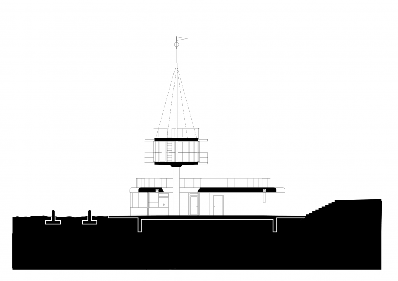 This ‘machine à surveiller’ wants to be virtually absent, yet highly visible at the same time. From the boulevard, only the elevated look-out shows itself, as the cornice of the pavilion coincides with the horizon at sea. From the beach however, a cylindrical object lets in the most democratic of public spaces from all sides. It is bright yellow as plastic beach toys and buoys – as the sun, and one of the universal colours of the lifeguards. A sense of safety is induced by the pavilions’ taboo-free transparency and permeability.