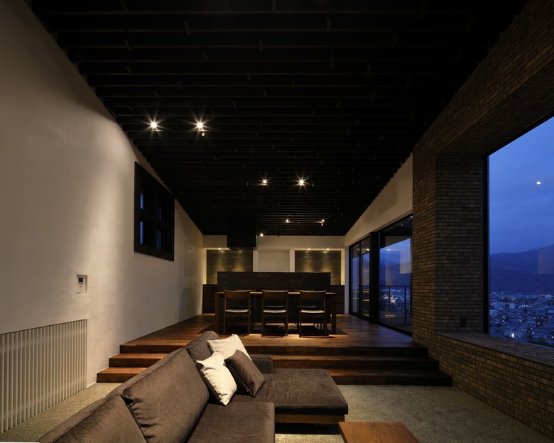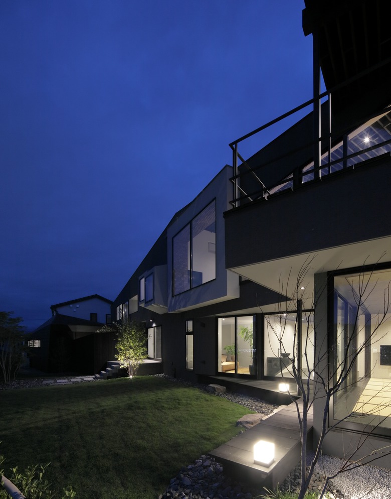 This is Saruta’s family house, facing the ridgelines of the beautiful mountains and Matsumoto Castle and Matsumotodaira below the site. We believe that the most important thing in this kind of location house is how to frame the beauty and change of nature such as sky color, flow of clouds and expression of mountains, so that we find forever full of fresh discoveries. The random opening which seems to be opened freely at first sight is window which is actually arranged with various sizes, depths, finishes, shapes and heights to be able to enjoy various sequences when walking and sitting. Barnacle shape of bay window is a device to makes the appearance impressive as well as raise shadow volume inside. The road side was closed to secure privacy, but on the other hand, the landscape side is completely opened like single side lighting house. In addition, we set up a music building for pianists as well in the same site. We design beautiful wood structure beam with the idea of Kaburatsuka like traditional Matsumoto house but arrange to modern and minimal. We believe that we were able to have a free-firing and bold internal composition.