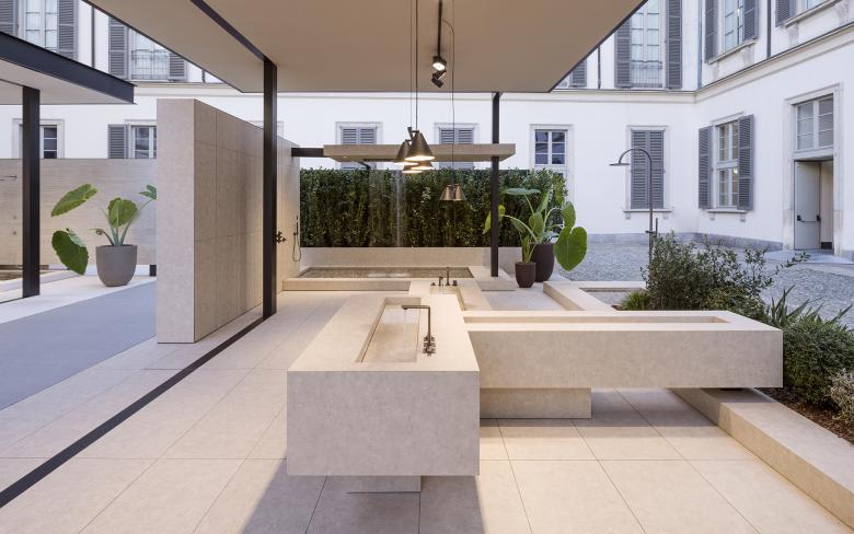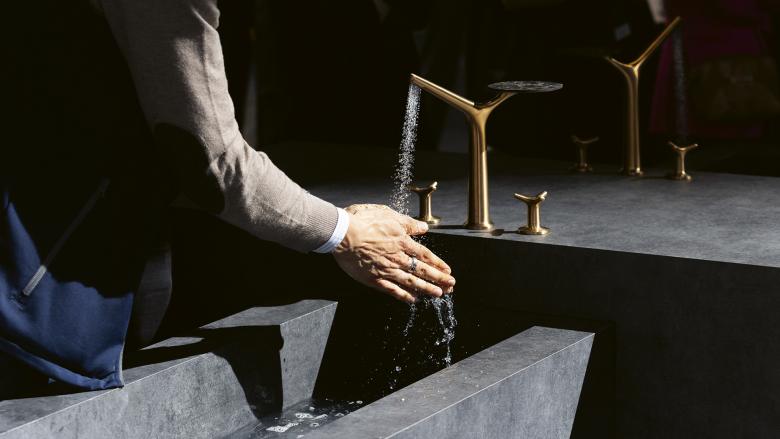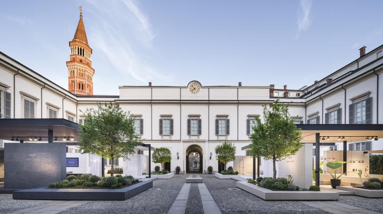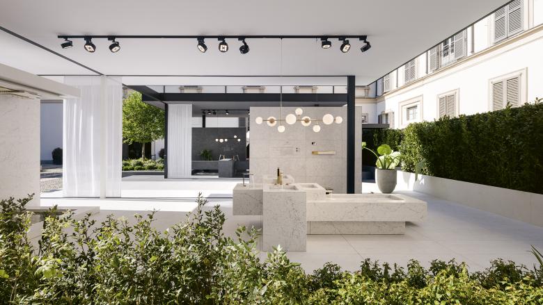 Every year, the international design community gathers in Milan for the furniture fair and Design Week. GROHE presents its premium sub-brand GROHE SPA in an immersive installation at the Palazzo Reale in the city center. The concept was developed in collaboration with the Design and Brand Identity team of LIXIL Global Design. The idea of "Aquatecture" merges water and architecture, transforming the Cortile d’Onore, the former courtyard garden of the Palazzo, into an oasis-like inner courtyard.