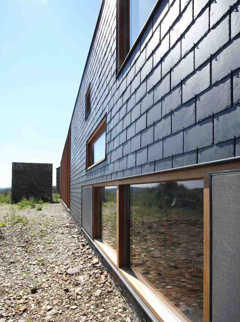 The chosen material is simple, austere, natural and contextual: slate, wood and rubble. The house’s shape is reinforced by finishing the roof surface and the walls uniformly with charcoal grey slate. The wooden exterior joinery gives the house a warm touch and forms a nice contrast with the slate cladding and the rubble masonry.