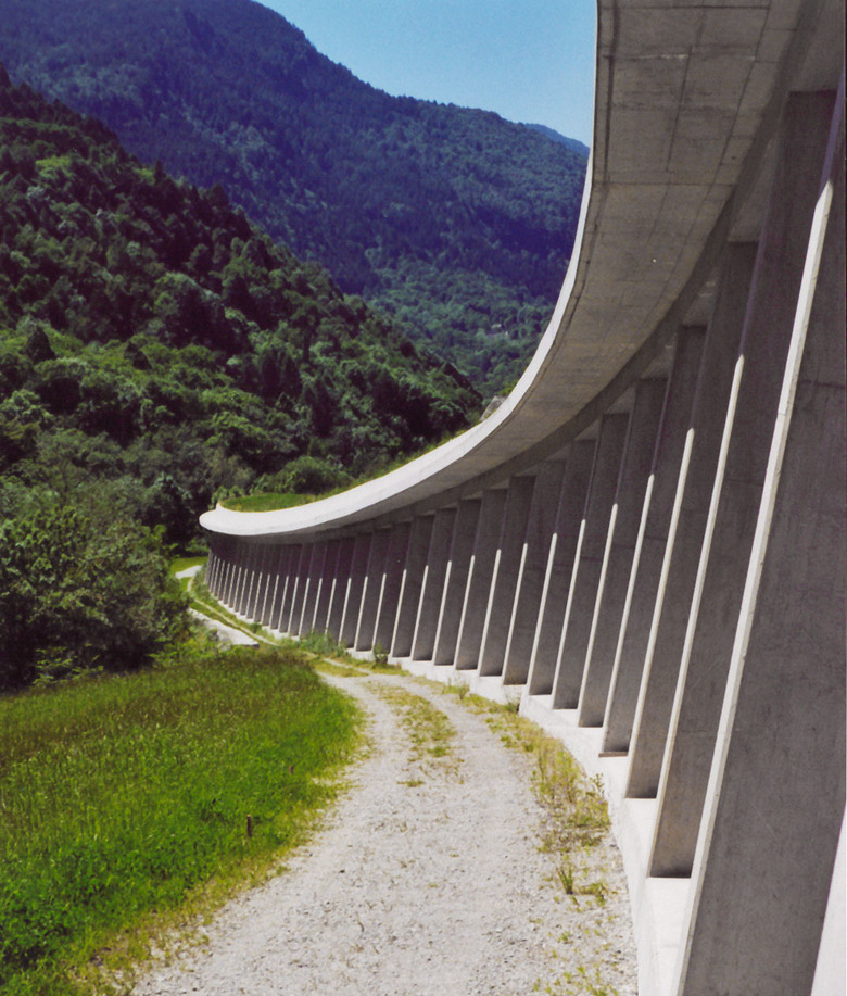 Das Grenzdorf Castasegna sollte mit einer in unmittelbarer Dorfnähe verlaufenden Umfahrung vom Durchgangsverkehr befreit werden, der bis dahin über die einspurige Dorfstrasse geführt wurde. Kernstück der Umfahrung bildet die ca. 300m lange Galerie. Das Erscheinungsbild in sehr hellem Beton gehaltenen Galerie wird geprägt von der S-förmigen Linienführung, der um 5:1 geneigten Stützen sowie dem ebenso geneigten Randträger mit einem feinen Vordach. Der Autofahrer erlebt die Galerie als transparente, dynamische Konstruktion.