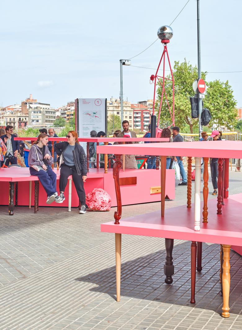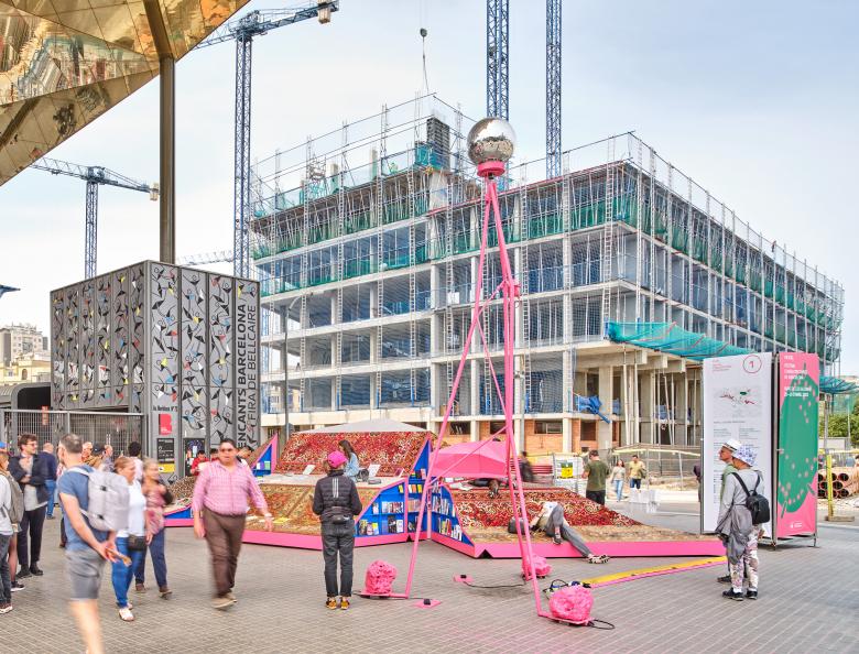 With the aim of activating new possibilities for democratic and alternative horizontal debates beyond the logic of the market, the project combines clusters of bright pink furniture—echoing the triangular geometry of the Encants roof—with three wiry, slender, and atmospheric structures. Together with two additional elements, these five components open, close, and move, evoking the surreal artifacts of the Garden of Earthly Delights and transforming the site into an enchanting, participatory environment that invites exploration, gathering, and collective exchange.