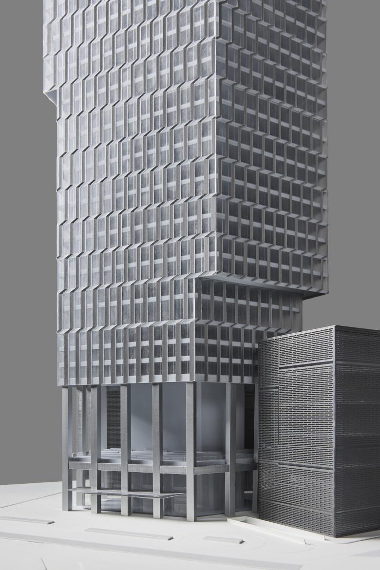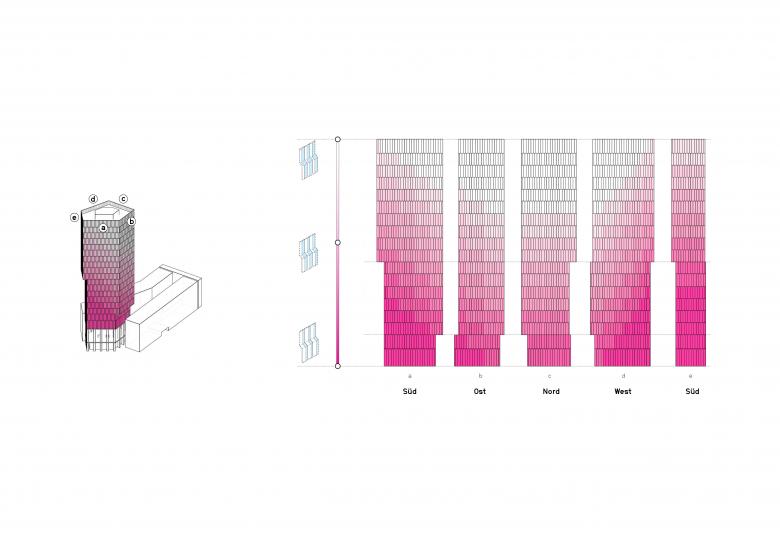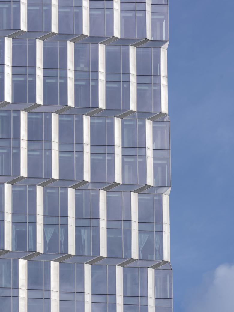The façade of the Cloud Tower gives the impression of a folded envelope, which is composed of stainless-steel panels slightly shifted against each other. Inspired by the lightness and transformability of clouds in the sky, the relief-like façade elements create a lively interplay of light and shadow that changes depending on the time of day and weather. The reflective glass surfaces of the façade capture the current cloudscape, making the building appear to merge with the sky. Flexible panels, which vary depending on the side of the building and the position of the sun, help to reduce direct sunlight and allow plenty of daylight to flow into the interior.