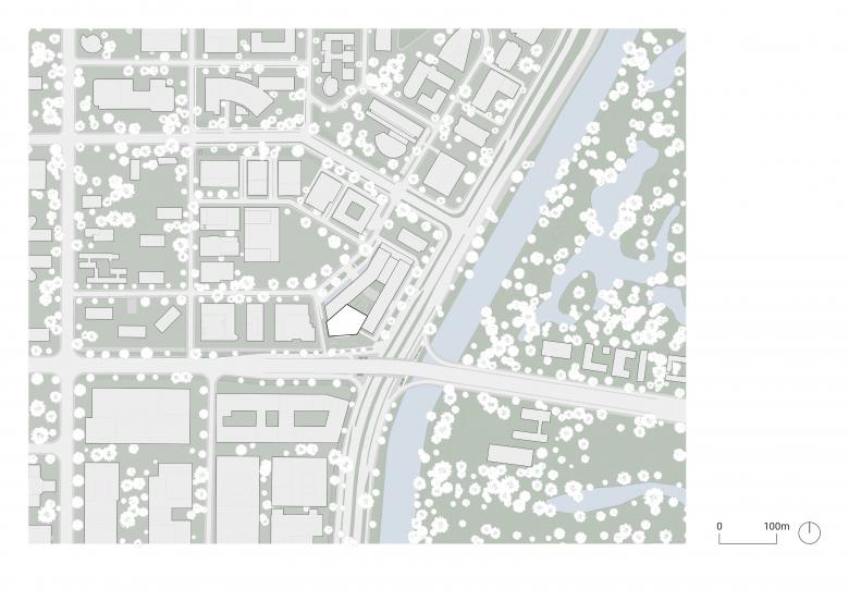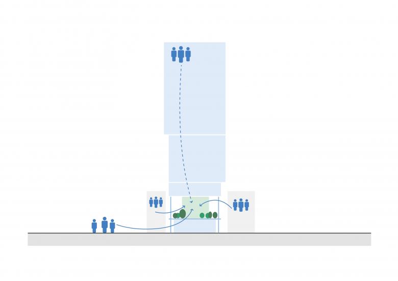 Towards the outside, the base floors are kept open in order to create a publicly accessible lobby, which serves as an urban living room, and an elevated garden above, where events and art exhibitions can be held. The garden functions as a connecting platform for the existing buildings and houses leisure spaces, sports facilities, and cafés—also benefitting the wider public in the area. The open base allows for daylight and air in the courtyard and the lower office buildings.