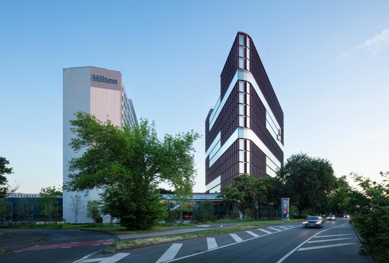 Düsseldorf, den 16.11.2023. Direkt am Kennedydamm ragt das 16-geschossige Bürohochhaus Eclipse, entworfen von HPP Architekten in Zusammenarbeit mit UNStudio im Auftrag von die developer, mit seiner markanten Glasfassade in den Himmel. „Das Eclipse agiert als ein Kommunikator und schafft eine städtische Verbindung zwischen Nachbarschaft und Arbeitswelt“, sagt Werner Sübai, Senior Partner bei HPP. Als direkter Nachbar des Hilton-Hotels, ist Eclipse über einen zweigeschossigen Sockel mit dem Hotelbau aus den 70er Jahren verbunden und erstreckt sich in der Form eines dreieckigen Prismas über 60 Meter in die Höhe. Unter dem spitzesten Winkel des Prismas, mit einer Auskragung von elf Metern und dort von einer V-Stütze aus Stahlbeton getragen, befindet sich der Haupteingang für die Besucher. Daran schließt eine offene und großzügige Empfangshalle mit einem Atrium über mehrere Etagen an. Details aus Holz, Wandverkleidungen aus weißem Feinsteinzeug und eine feinmaschige, bronzierte Streckmetallverkleidung der Glasaufzüge zeugen von einem gekonnten Spiel mit Materialien, eine breite Treppe führt hinauf zur Empore der ersten Etage, die Sitzstufen lassen die Halle zum Auditorium werden.