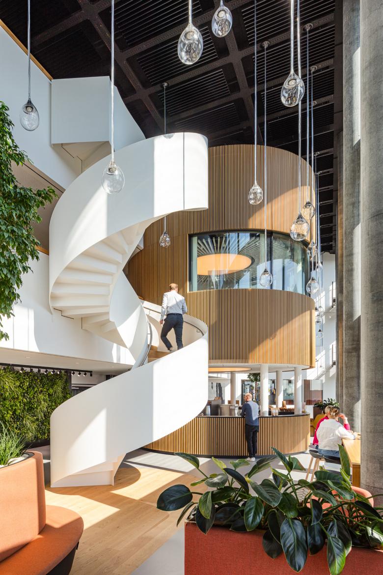 „In der Smart Working Umgebung von Eclipse werden Kunstlicht und Lüftung über Sensorik präsenzgesteuert, das Eclipse berücksichtigt die Bewegung eines jeden einzelnen Nutzers,“ erläutert Anika Hülser, Associate Partnerin bei HPP. Möglich ist dies durch 2.000 Sensoren, die in Echtzeit Daten sammeln und an die ©smartengine übermitteln. Dadurch können in einem Gebäude dieser Größenordnung bis zu 200 Tonnen CO2-Einsparungen pro Jahr erzielt werden – wodurch Eclipse sich als ein besonders nachhaltiges Bürogebäude präsentiert. Angestrebt sind sowohl die DGNB Platin als auch die DGNB Diamant Zertifizierung – die höchste Auszeichnung für gestalterische und baukulturelle Qualität.