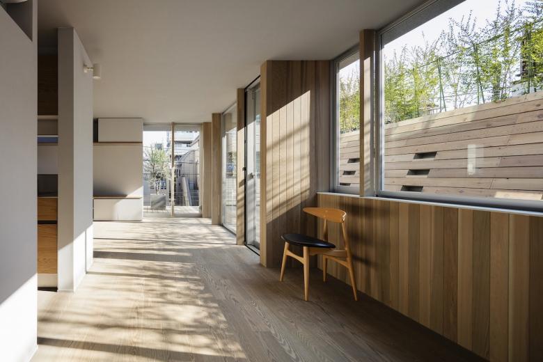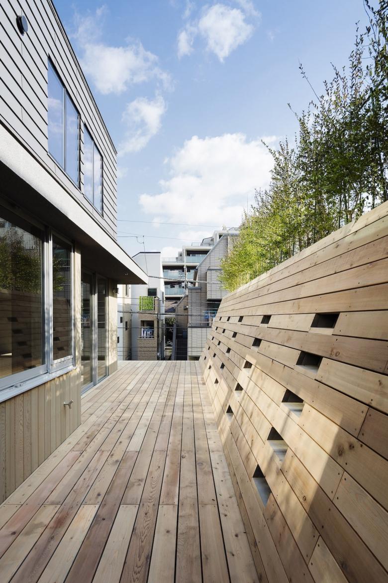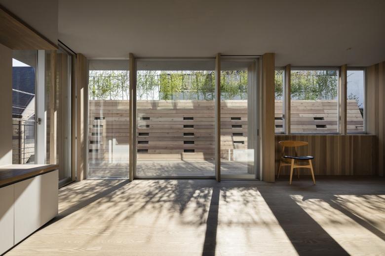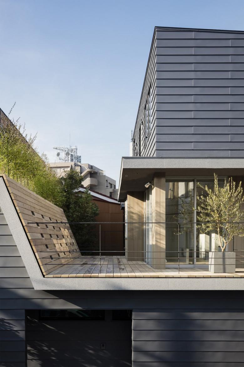 Trees planted along the elevated edge of the roof further shield the home from the third floor of the apartment building and bring dappled light inside, allowing the residents to enjoy the shifting patterns of light and greenery.