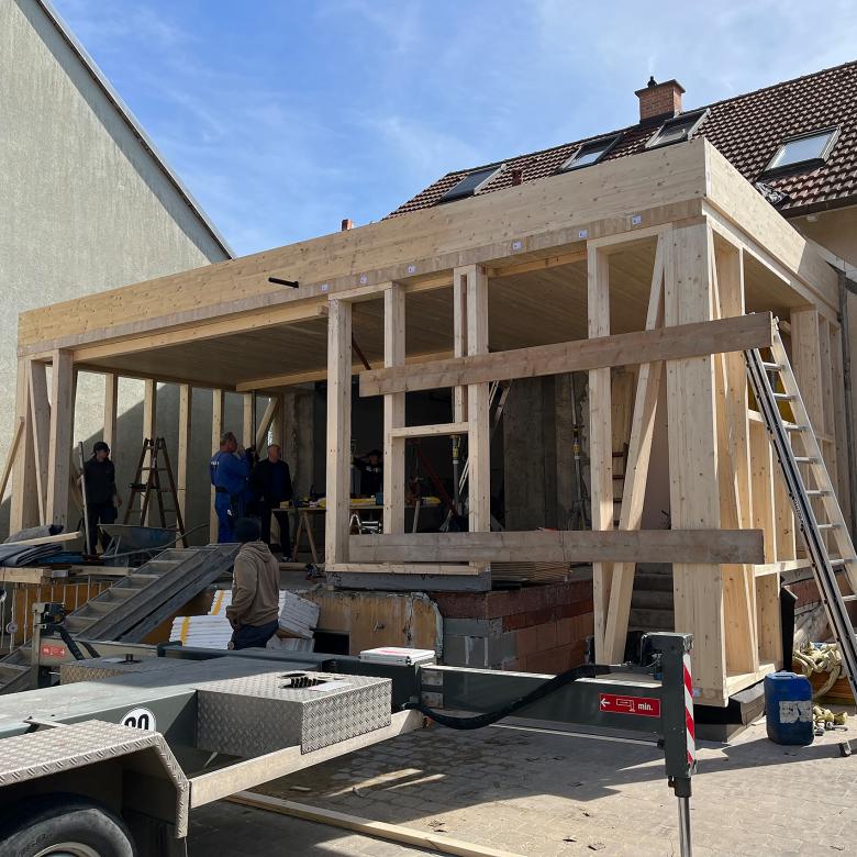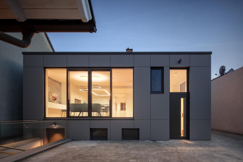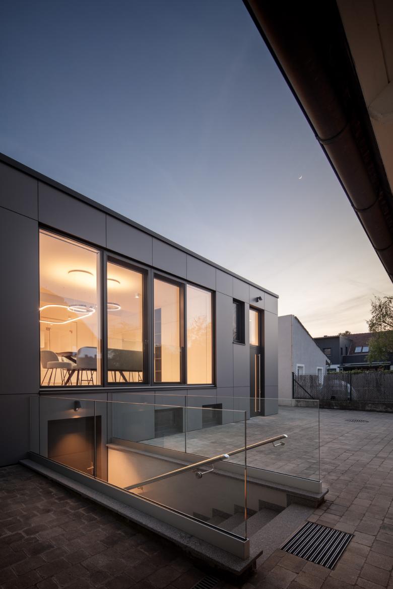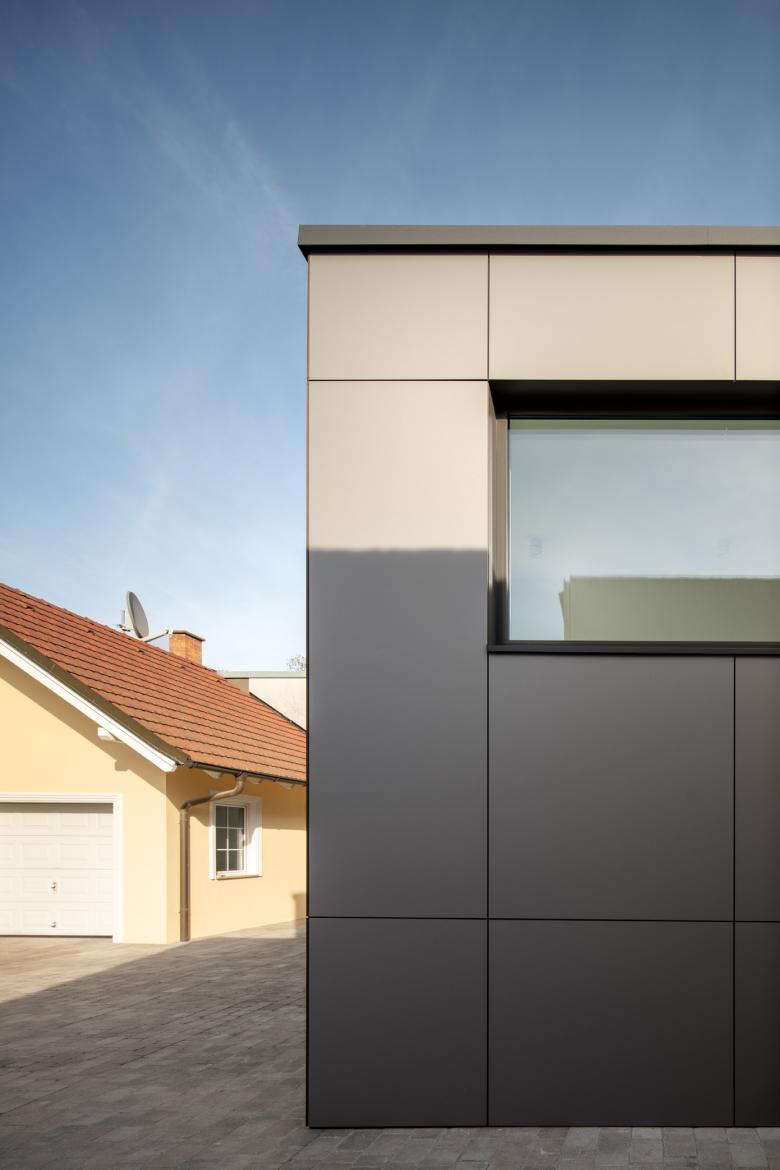 Konstruktiv besteht der Zubau aus einer Pfosten-Riegel-Holzkonstruktion mit einer Brettsperrholzplattendecke. Die Fassade wurde mit hinterlüfteten HPL-Platten gemacht. Die Fenster sind Holz-Alu-Fenster. Beheizt wird der Zubau mit einer Fußbodenheizung.