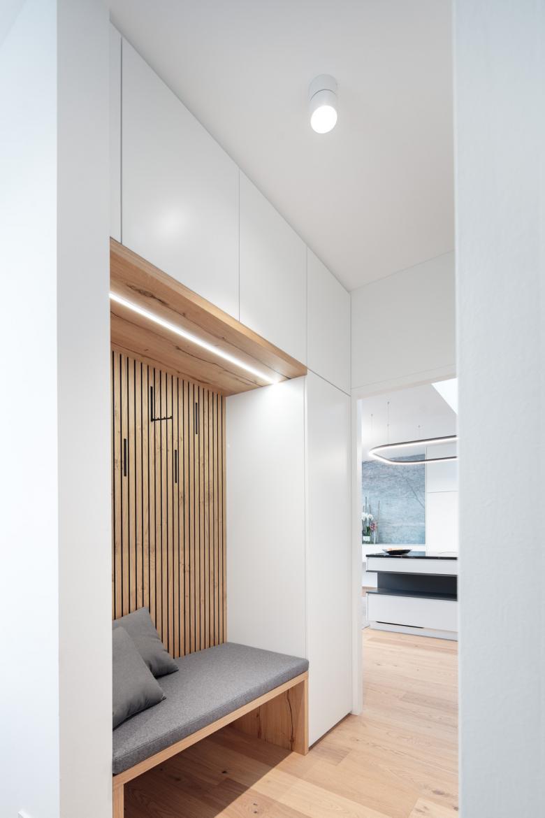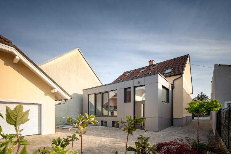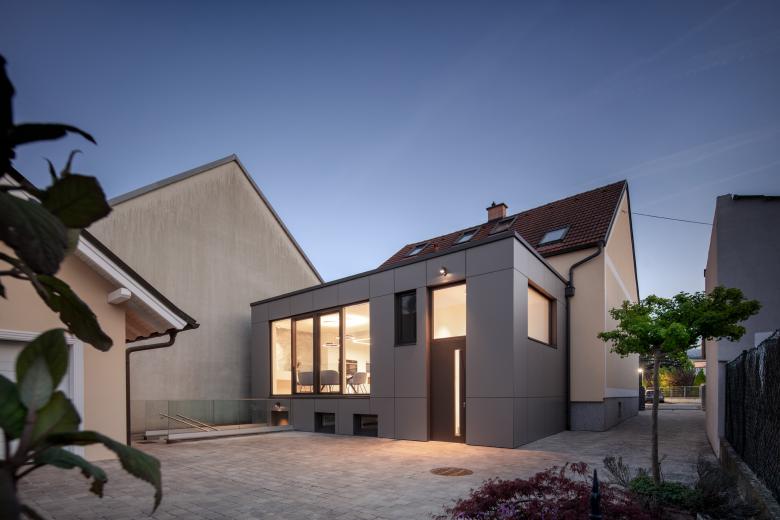 Es wurde folgende Lösung entwickelt: der Windfang wurde entfernt und auf der ganzen Fläche des nordseitigen Kellers wurde ein Holzbau errichtet. Dieser vereint nun den auf Gartenniveau liegenden Zugang mit einer Innentreppe und ermöglichte eine direkte Verbindung in die große Wohnküche. Dafür wurde in der ehemaligen Außenwand ein großer Durchbruch hergestellt. Im Innenraum ist keinerlei Trennung zwischen Altbestand und neuem Zubau abzulesen. Mittels einer großen Fensteröffnung mit raumhohen Schiebetüren wurde eine Verbindung zum nördlich gelegenen Garten realisiert.