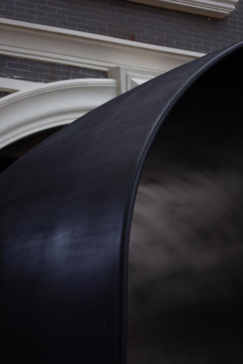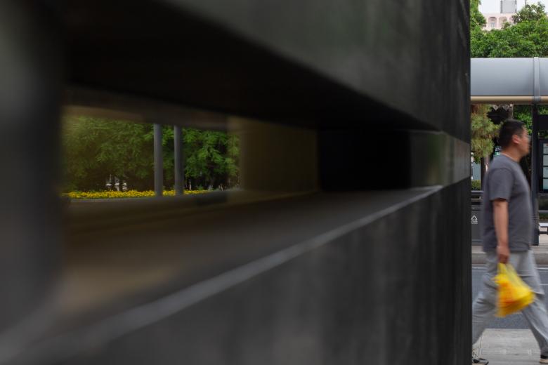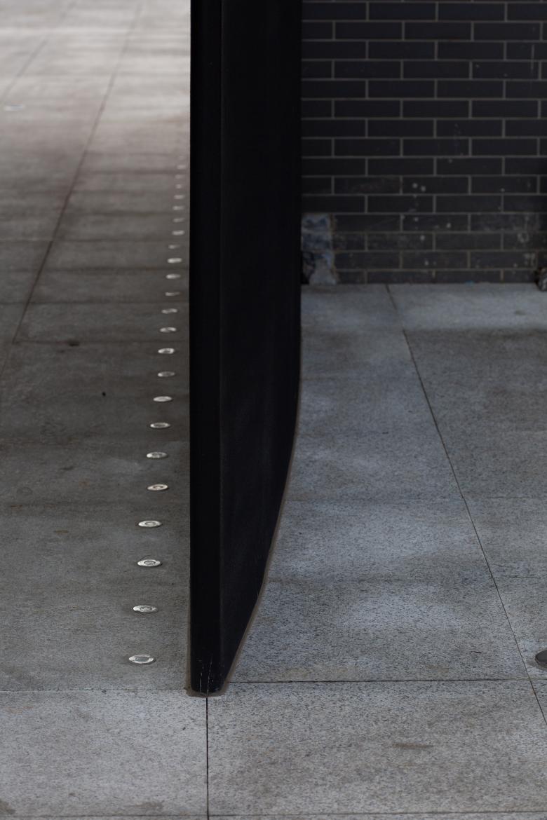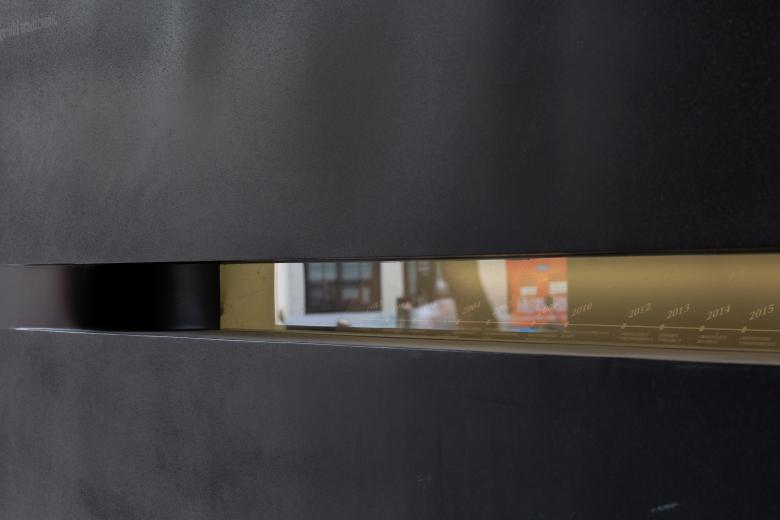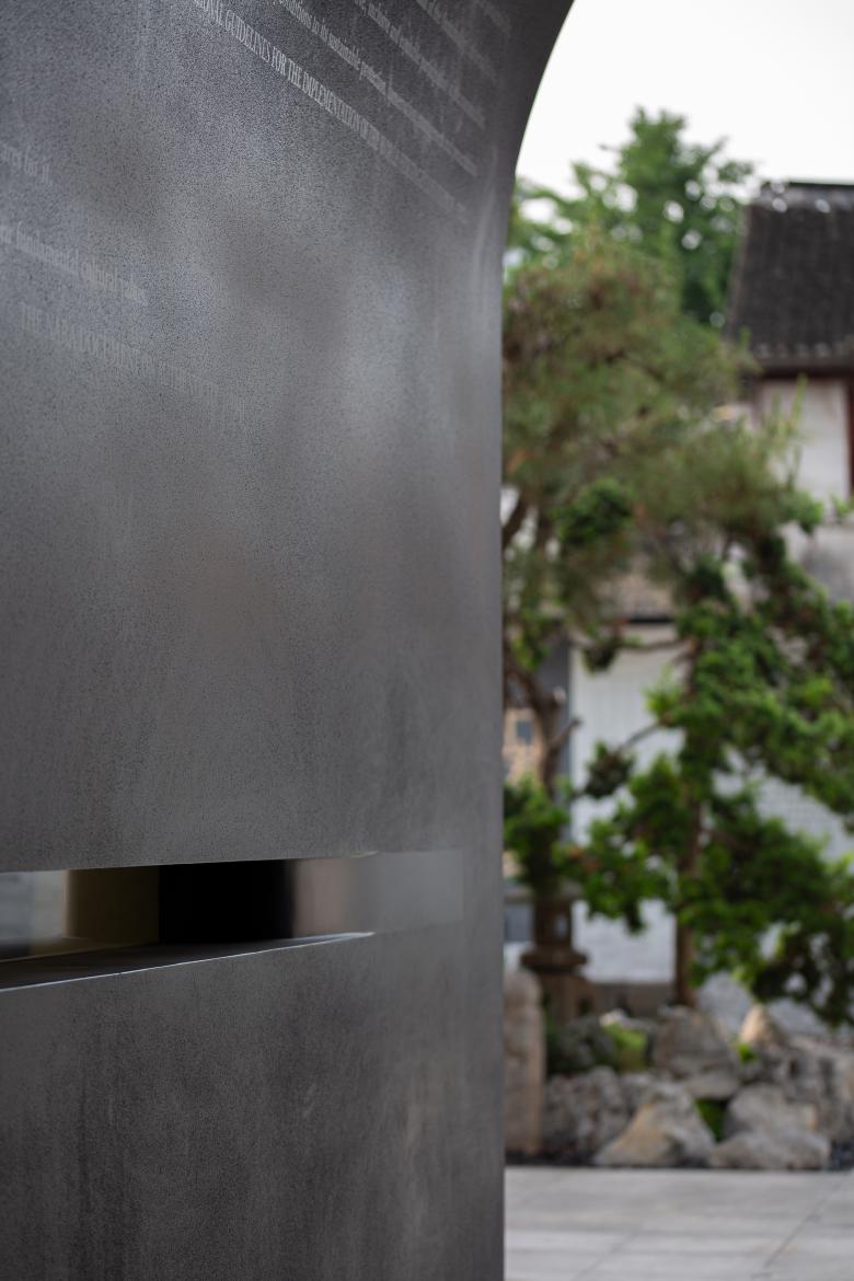 The gate structure is made entirely of stainless steel framing and panels, with a black fluorocarbon coating. Different surface textures are used to display museum introduction/statement texts. The thickest part of the tapered walls houses observation windows on both sides, positioned at eye level. These windows offer views into small exhibition spaces set in the adjacent side rooms of the existing building, where rotating displays of images or physical objects are presented.