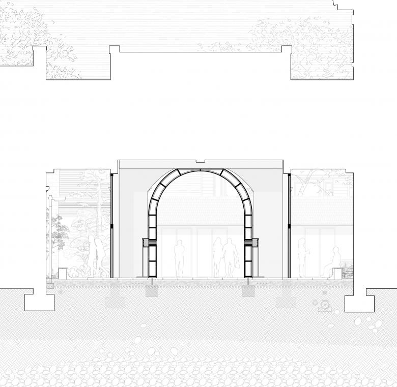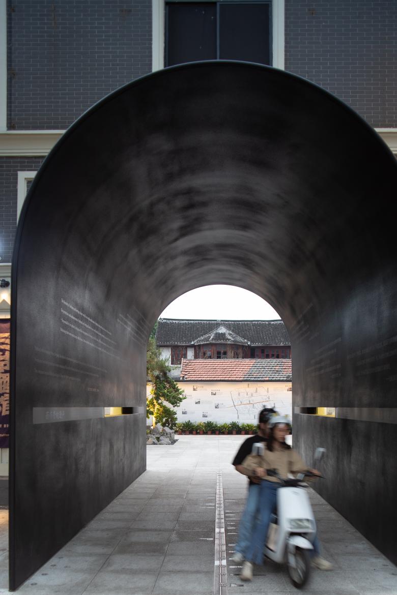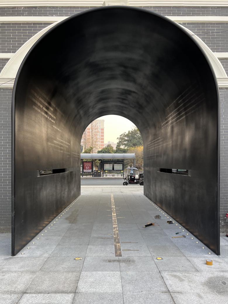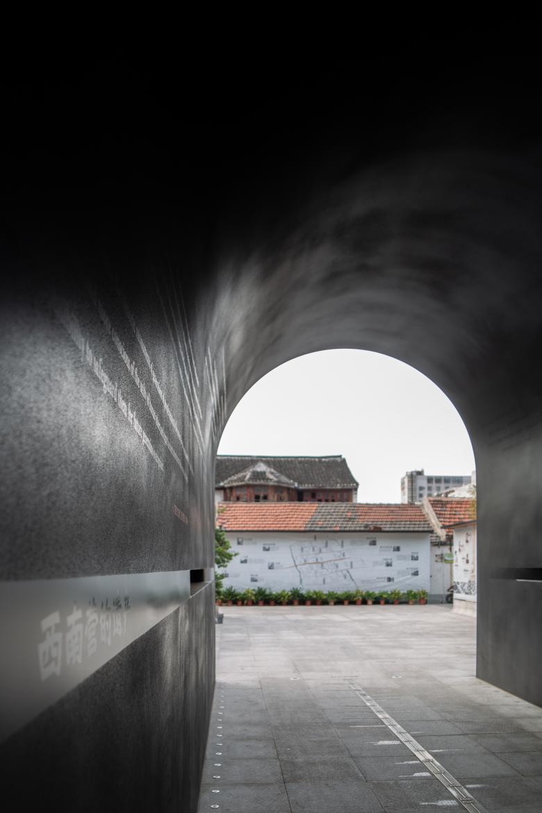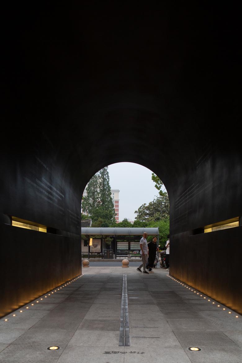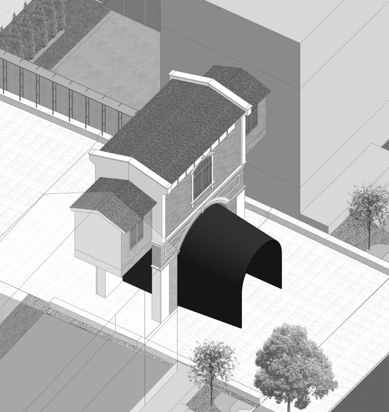 Given these site conditions, our design introduces an entirely new structure in a firm and grounded manner, serving as a footnote to the site's layered history. The gate arch simulates the traditional height and curvature proportions of an old city gate but extends the depth to 9 meters to enhance a sense of spatial depth. At the same time, the thickness of the passage walls gradually increases from both ends toward the center, creating an appearance of an alien object—something otherworldly. As a result, we encounter a landscape that is both unfamiliar and familiar: the exterior form stands apart from the surrounding retro commercial buildings, while the interior experience evokes something recognizable and traditional, pointing directly to the city’s ancient past.