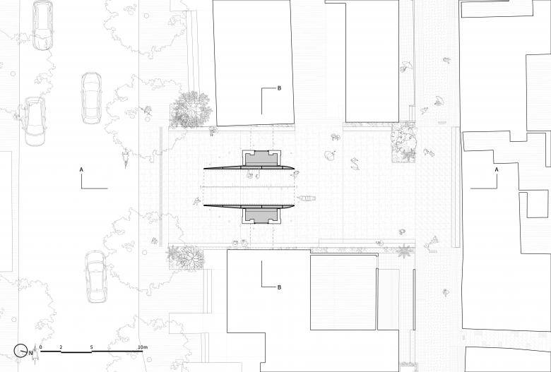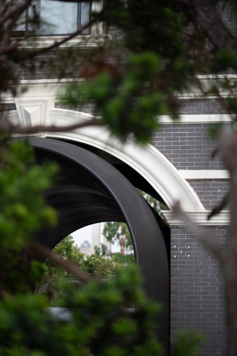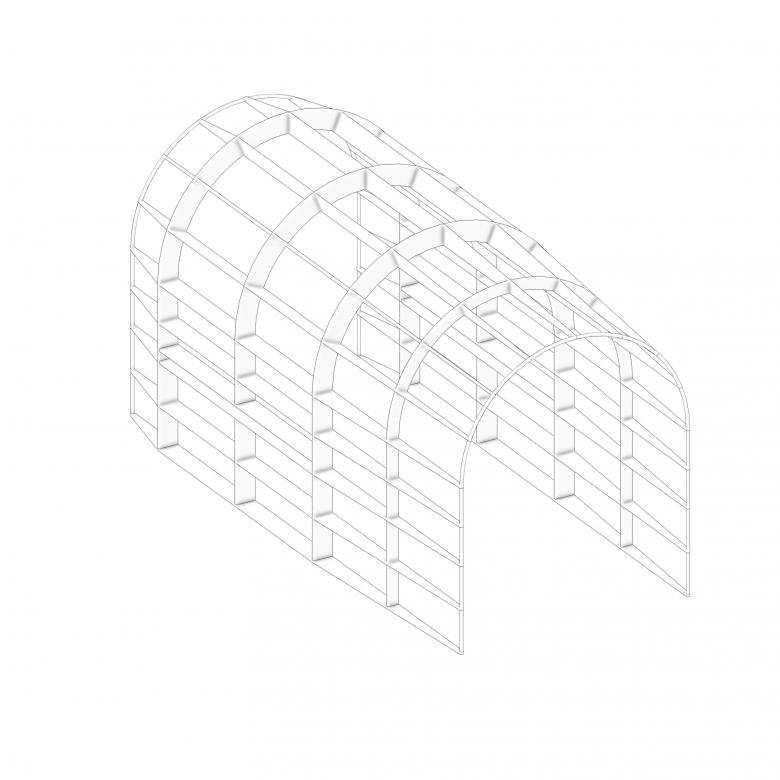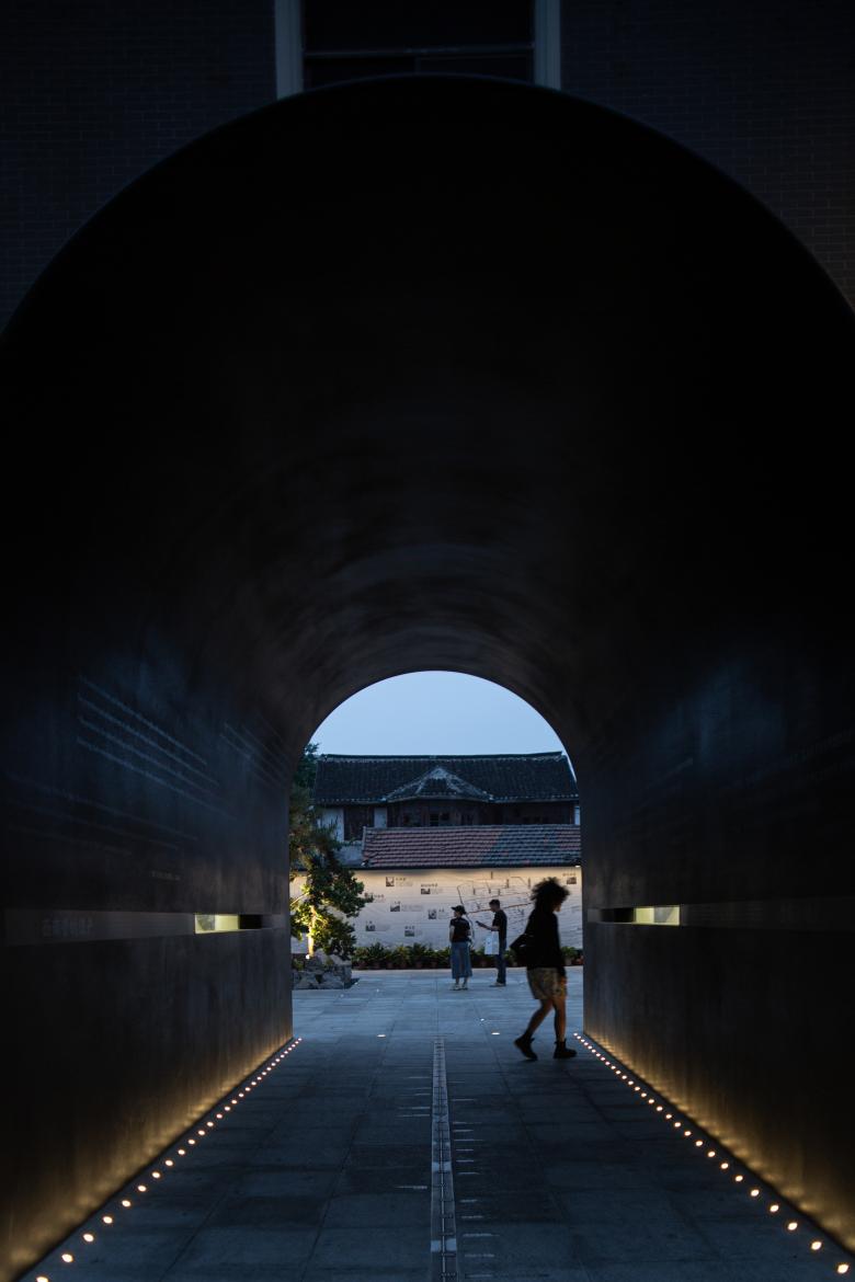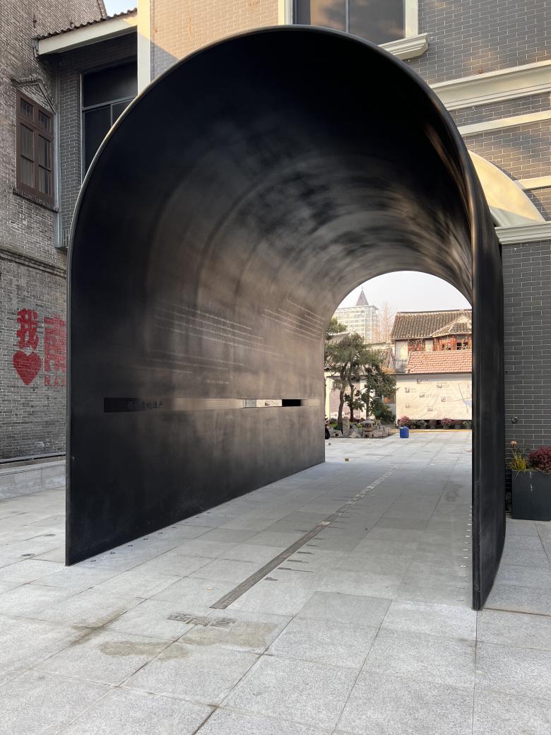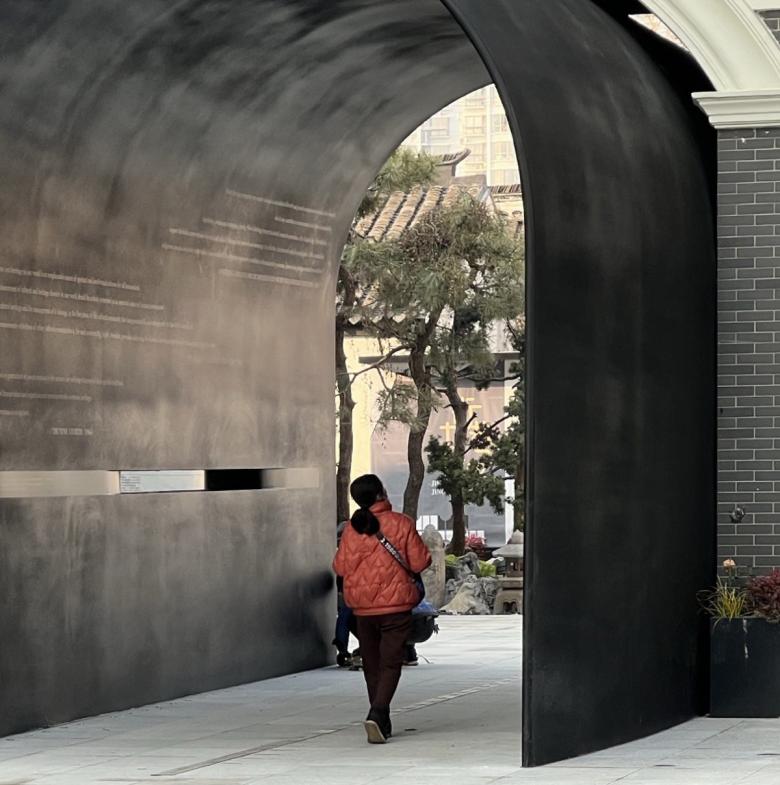 Given these site conditions, our design introduces an entirely new structure in a firm and grounded manner, serving as a footnote to the site's layered history. The gate arch simulates the traditional height and curvature proportions of an old city gate but extends the depth to 9 meters to enhance a sense of spatial depth. At the same time, the thickness of the passage walls gradually increases from both ends toward the center, creating an appearance of an alien object—something otherworldly. As a result, we encounter a landscape that is both unfamiliar and familiar: the exterior form stands apart from the surrounding retro commercial buildings, while the interior experience evokes something recognizable and traditional, pointing directly to the city’s ancient past.