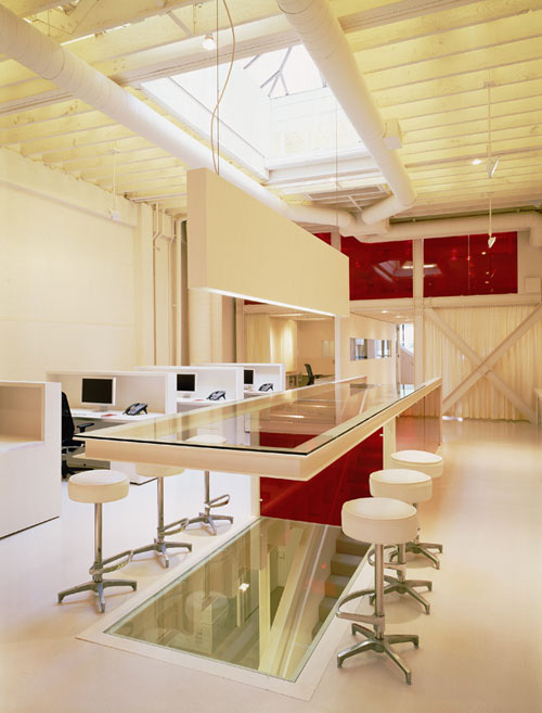 A two-story warehouse building in historic Jackson Square is home to this graphic design firm’s San Francisco branch office. The warehouse’s existing concrete shell and wood-framed roof were stripped clean, left exposed, and painted a uniform off-white. Bright, translucent red punctuates this luminous space in a series of dramatic, glass-clad rooms and structural details. The project’s focal point is a heroically cantilevered glass meeting table that floats over a glass floor allowing light into the basement below. The existing brick front façade was painted black and white, referencing the storefronts of London where the firm maintains their satellite office.