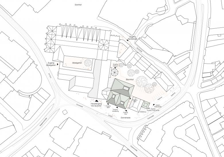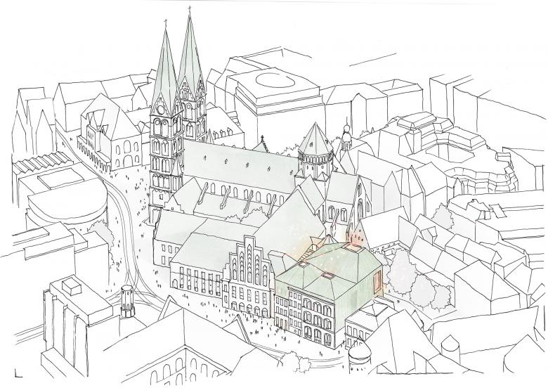 The interplay of the locally typical sloping roof surfaces and the inserted skylights creates a striking roof landscape. The copper roof cladding material used in the surrounding area will be adopted, thus linking the silhouette of the entire Domsheide. The materiality of the new building is thus also integrated into the history and visual appearance of the UNESCO World Heritage Site.
