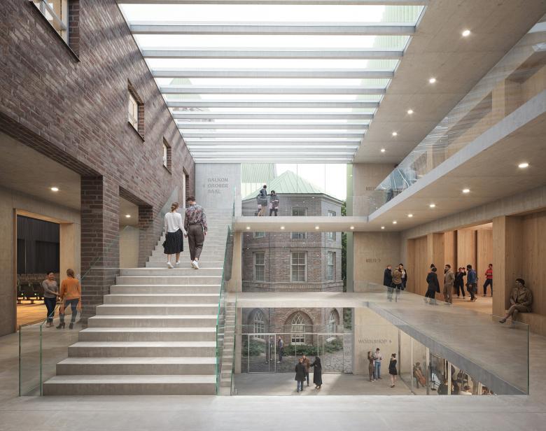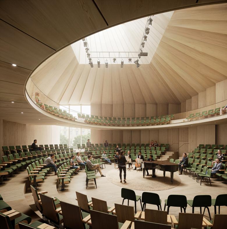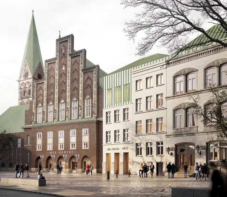 With the new building, the renowned concert hall “Die Glocke” is expanding its range of musical experience spaces and consolidating its position as a cultural nucleus in the heart of the city. The geometrically clear structure is respectfully linked to the historically significant old building via a glass joint. The new entrance foyer is also located here. In future, there will also be optimal conditions for workshops. Other listed buildings will be integrated into the new ensemble.