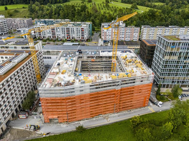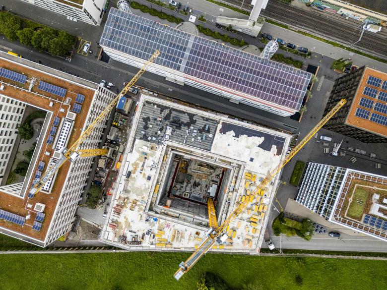 The proportion of concrete above ground is significantly reduced by a concrete skeleton construction and renewable and less processed raw materials are used in the wooden façade. A balanced proportion of windows optimizes the use of daylight, heat gains and losses in winter, protection against overheating and the consumption of gray energy. The building will be integrated into the heating network of the area and additionally equipped with a PV system.