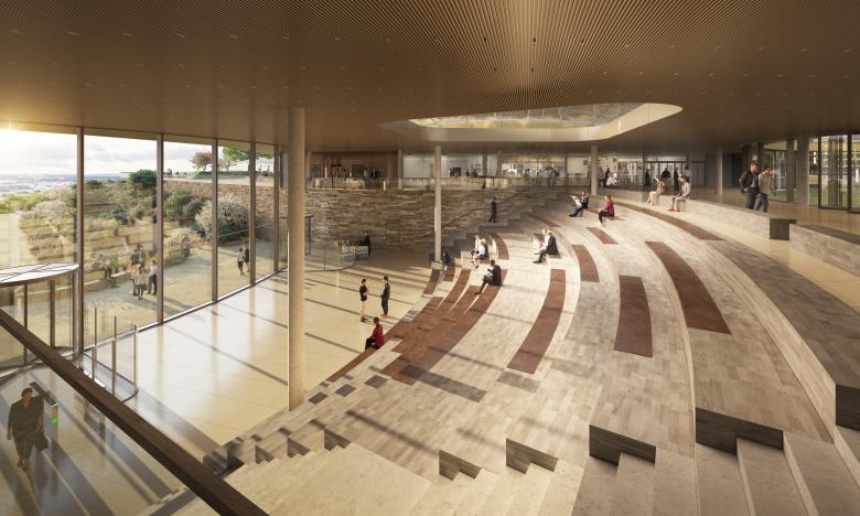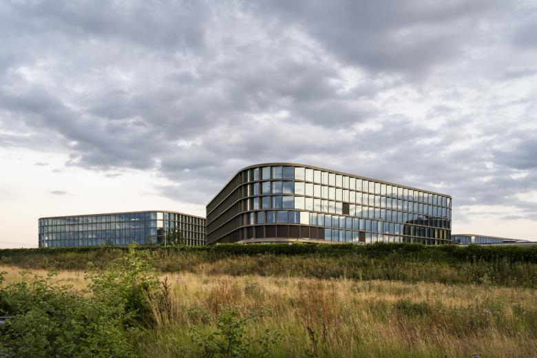 The positioning of the buildings with their rounded corners results in typical reception bays - each one destined to serve a specific purpose viz. as main entrance, service access or staff entrance - and each is assigned unmistakable and attractive priorities. The main entrance provides access to the conference facilities and the employee cafeteria. The current plans call for the realization of the first construction phase (approx. 3,000 jobs) of the state of the art campus toward the middle of the next decade.