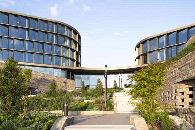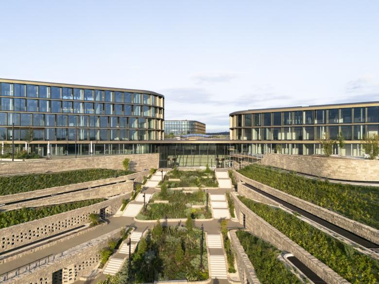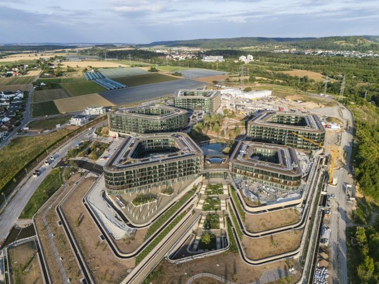 The layout of the new Project Campus in Bad Friedrichshall is similar to giant petals being placed in the distinct topography of the landscape. Notwithstanding the solitary impression the individual structures convey, they are positioned to encircle a common central green area. Staggered to resemble a terrace, the parking garage levels - some of which open toward the valley - are the base for the high-rise structures.