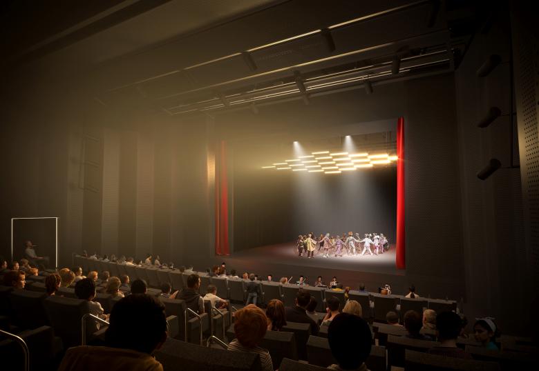 In addition to a studio stage with around 140 seats and two rehearsal stages, the theater is also home to a main stage with up to 360 seats. It also has a height-adjustable orchestra pit and offers wheelchair spaces and seats designed for both children and adults. The hall is kept dark for practical reasons and features pleated, origami-like walls that are both aesthetically pleasing and serve an acoustic function. The spatial concept is rounded out by multicolored stairs.